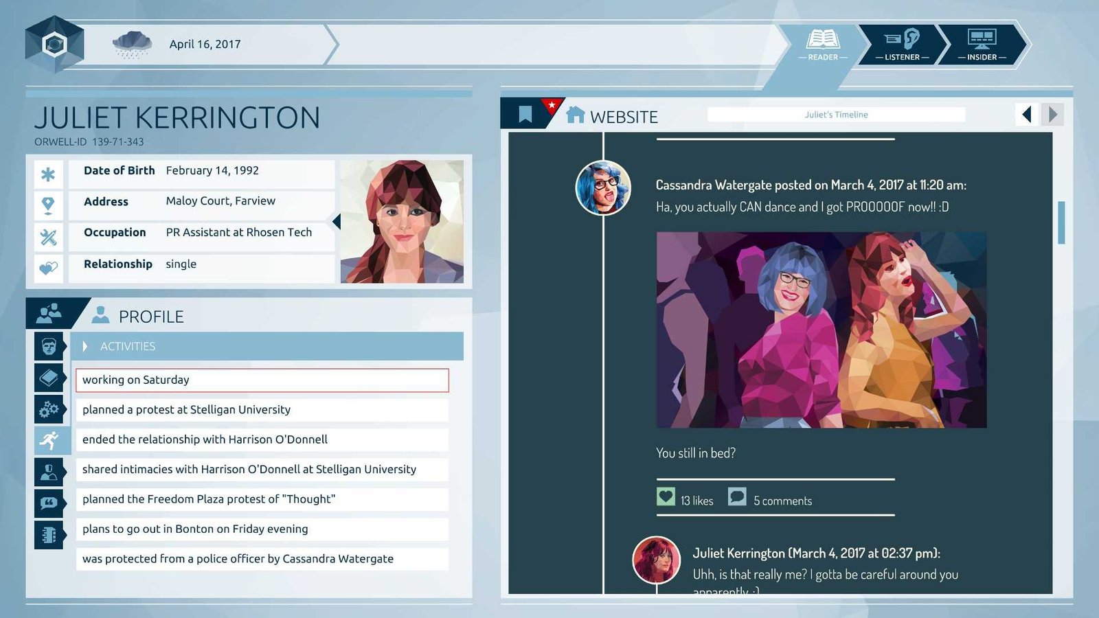 Chacun aura fait le parallèle avec George Orwell, auteur de La Ferme des Animaux et surtout 1984, dont le célèbre Big Brother sert d’inspiration au jeu de Osmotic Studios. Orwell est en effet un vaste système d’informations, regroupant des média différents qui permettent d’agréger des données afin de produire des profils de suspects. Aux commandes de ce jouet un rien invasif, le joueur entame alors son travail . Orwell est capable de mettre en surbrillance des passages qui semblent en rapport avec le suspect : charge au joueur de décider s’il souhaite intégrer ces données au profil ou non. La question n’est pas neutre : tout chargement est irréversible et entraîne, quelque part, un jugement de la machine. Chargez le fait que le suspect a frappé un policier ( sans trop vous soucier des circonstances ), et Orwell pourrait bien conclure qu’il s’agit d’une personne violente en général. La machine aime peu les nuances et préfère le calcul froid.