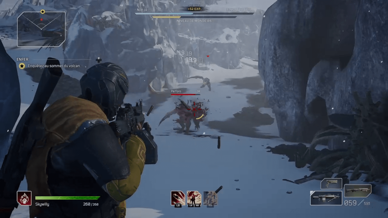 La courbe de progression du jeu est très particulière. Vous avez 30 niveaux d’expérience à acquérir au fil de vos missions réussies et des ennemis éliminés tout au long des différents niveaux. Mais vous verrez aussi une autre jauge à l’écran, celle du « niveau de monde ». Celle-ci augmente plus ou moins comme l’expérience, mais si vous mourrez, vous perdez un peu de cette jauge. Le but est donc de tenir bon jusqu’à la remplir pour débloquer le « niveau de monde » suivant qui représente finalement un mode de difficulté plus élevé. Il y a 15 niveaux de difficulté à débloquer qui, exponentiellement, améliorent tout ce qui fait votre progression : du loot de meilleure qualité et de plus grand niveau, lié à des ennemis évidemment plus costauds à battre.