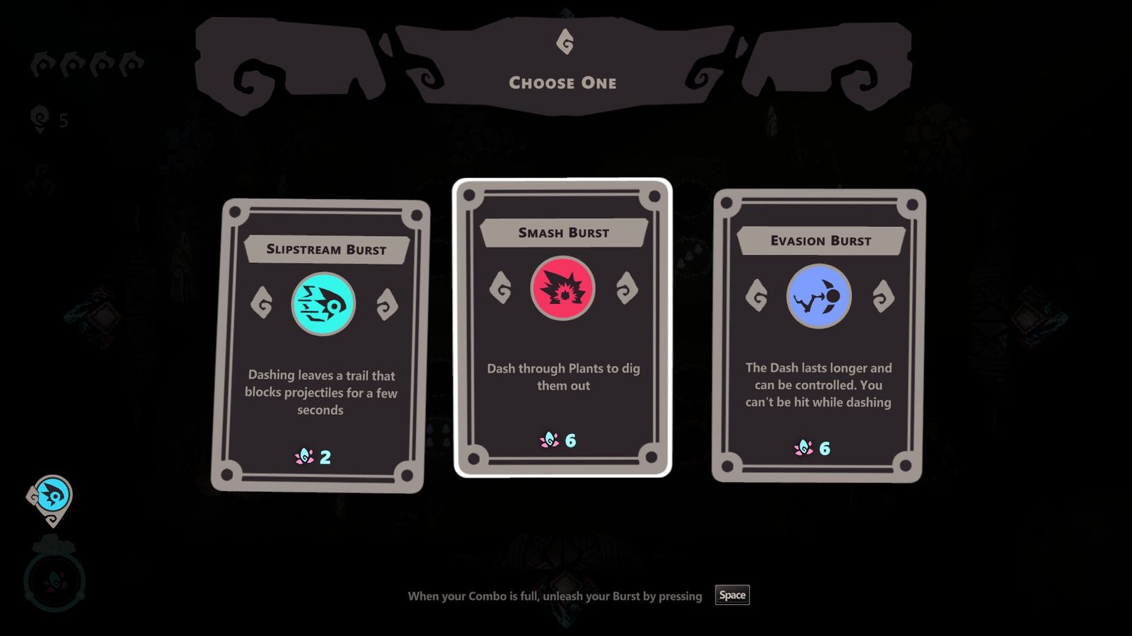 Au fil de votre progression vous obtiendrez différents bonus pour vous aider : bouclier qui encaisse une attaque, augmentation de force pour déterrer plus vite les végétaux, point de vie supplémentaire et bien d’autres choses. Une fois une salle complétée, vous aurez le choix entre différentes destinations avec un aperçu de leur difficulté (de 1 à 4). Le donjon est généré procéduralement à chaque partie et le nombre de salles différentes est vraiment énorme, même après quelques heures il est rare de retomber exactement sur la même.