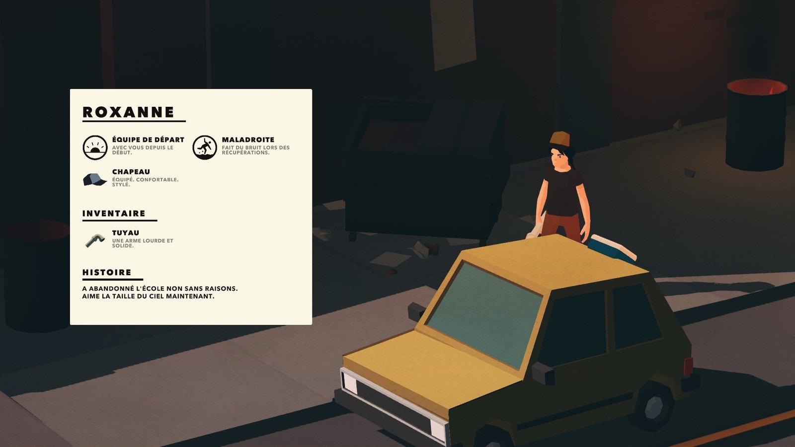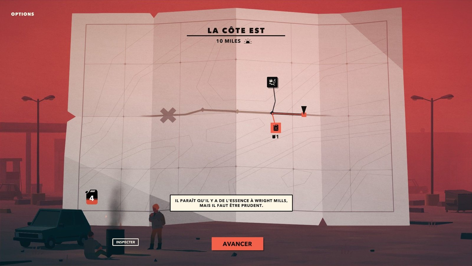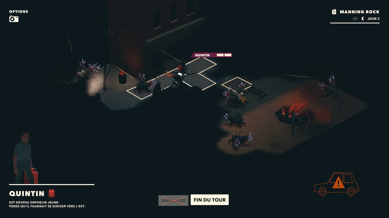 Le système de jeu est lui aussi assez épuré, chaque personnage non blessé a deux actions par tour, et le but est de traverser les petites cartes qui composent le jeu en récupérant un maximum de trucs utiles, tout en évitant au maximum les combats. Le souci c’est qu’il n’y a pas de tutoriel, les mécaniques obscures du jeu (et essentielles) ne se découvrent pas facilement, et comme le droit à l’erreur est inexistant, c’est à la dure qu’on retourne au charbon pour essayer d’avancer encore plus loin pour… Pas grand chose.