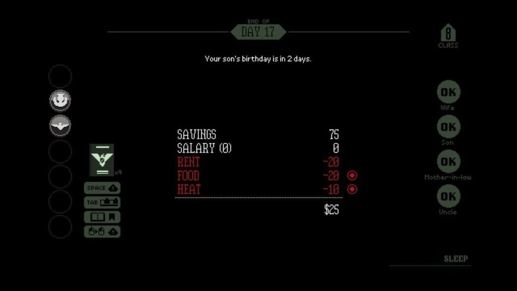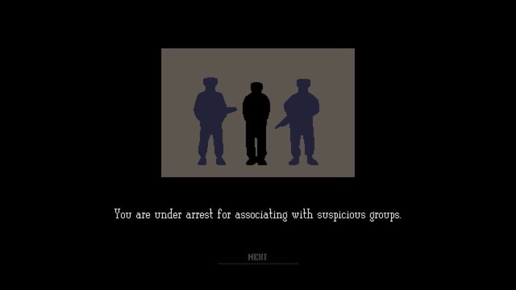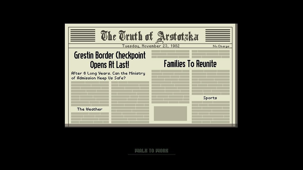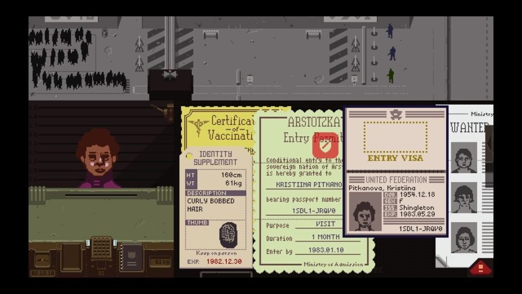Le gouvernement durcit la politique d’admissions, il me faut contrôler de plus en plus de choses. Des permis de travail, des fiches d’identité complémentaires, des autorisations diplomatiques, des carnets de vaccination… Pour le bien de Arstotzka, pour sa sécurité. Chaque cas demande de plus en plus d’attention, de plus en plus de temps. Ma productivité baisse, et avec elle mon salaire. Et cette femme qui veut entrer pour rendre visite à son fils malade… son permis n’est pas à jour. Mon fils aussi est malade, je n’ai pas de temps à perdre à discuter. Accès refusé, suivant.