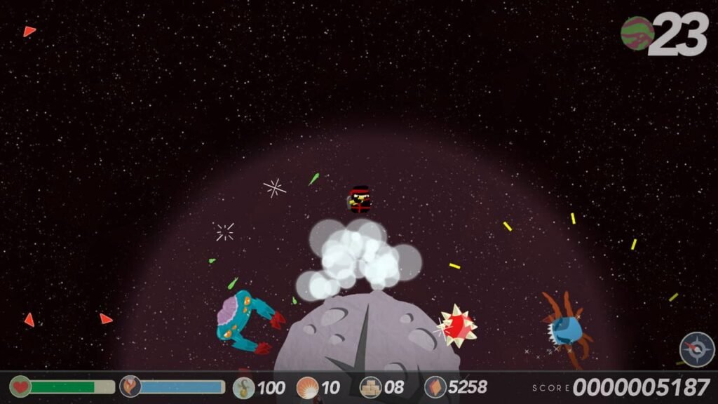 Vous jouez un petit cosmonaute que vous pouvez faire voler dans l’espace. A la rencontre de la gravité d’une planète, représentée par un halo bleu, vous « tomberez » sur celle-ci et pourrez y détruire les quelques aliens qui y habitent avec votre petit pistolet laser. Ensuite vient le moment ou il faut planter sa graine, pour faire pousser des arbres qui eux-mêmes vous donneront des fruits pour d’autre graines, d’autres arbres, etc. S ur une planète, notre Fuel remonte peu à peu pour des escapades en jetpack dans l’espace qu’il va falloir apprendre à contrôler. Mais pour reprendre de la vie, il faudra planter assez d’arbres sur une planète pour la rendre verdoyante et pouvoir « pomper » toute sa vitalité. Les idées de gameplayOu « jouabilité » en français, fait référence à la façon dont le joueur interagit avec un jeu vidéo. sont intéressantes et on s’y perd rapidement, surtout grâce à une jouabilité déjà passionnante. Sur les planètes, v ous pourrez aussi créer des tourelles pour vous défendre : des lasers, des boules de feu mais aussi des statues Moai venant fracasser le sol pour frapper les ennemis ayant atterris près de vous… Dans les airs, il faudra se battre contre des soucoupes volantes (qui lâchent quelques aliens en plus de vous tirer dessus) et des robots tueurs. Enfin, au bout d’un certain temps, un dragon géant cracheur de feu viendra vous faire la peau avec sa grosse barre de vie, sa musique qui devient beaucoup plus sombre et le signe que c’est le combat de votre vie : difficile, ce défi vous fera récolter un max de petits cristaux.