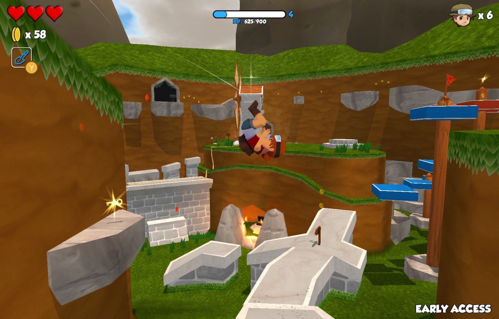 D’emblée Poi s’avère être très plaisant, un capital sympathie se dégage directement de ce jeu et on a envie de l’aimer immédiatement. On se retrouve sur un bateau volant et on va se diriger vers le premier monde disponible : Cozy Canyon. Vous devrez alors atteindre des sommets pour récolter des clés ou des pièces, explorer des grottes, activer des mécanismes, etc. Outre ces missions quelque peu classiques d’un jeu de plateformes, vous pourrez aussi chercher les fossiles disséminés sur l’île et les déterrer à l’aide de la pelle achetée chez le marchand ou explorer afin de découvrir tous les lieux cachés. On passera donc une à deux heures sur ce premier monde selon si on veut le compléter à 100% ou juste récolter suffisamment de badges d’explorateurs pour passer au monde suivant.