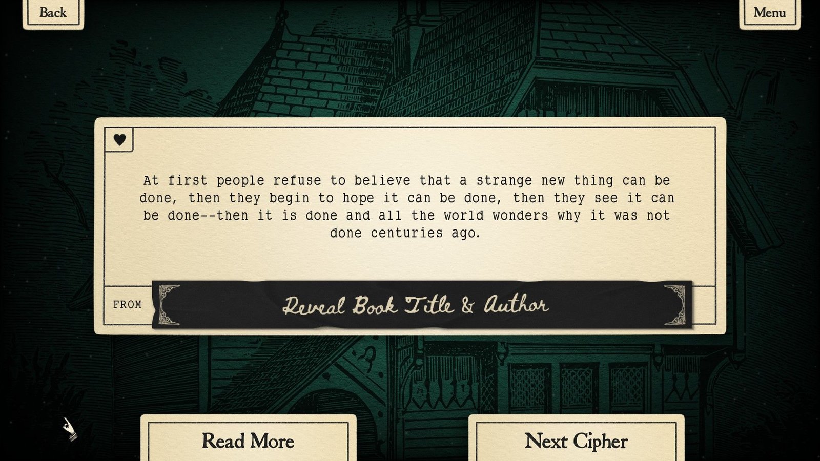 Avec 350 puzzles à compléter, répartis en sept catégories de roman (aventure, conte pour enfant, horreur, science-fiction, drame, mystère et classique), le sous-jeu, une fois la phrase découverte sera de découvrir l’œuvre d’où est tirée la phrase avant de retirer le petit cache pour vérifier la réponse. Plusieurs niveaux de difficulté sont présents, correspondant au nombre de lettres déjà affichées sur le message, allant de 0 lettre (le mode le plus dur) à 6 lettres (le plus facile).