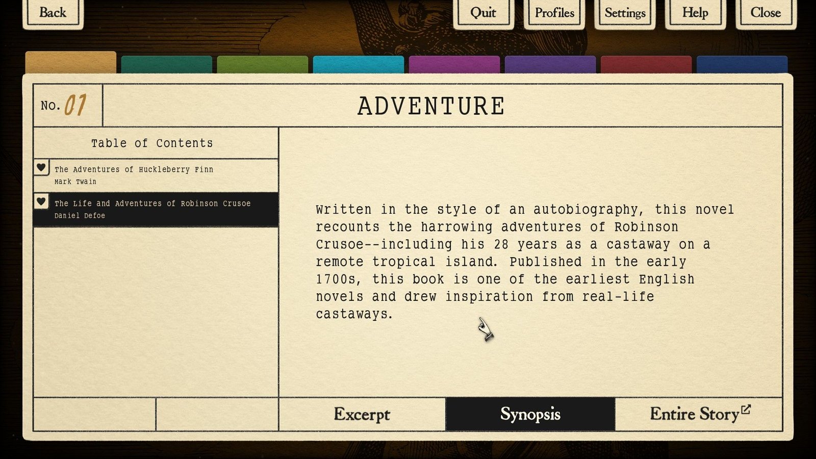 La principale difficulté viendra du fait que le jeu est uniquement disponible en anglais, avec un anglais assez soutenu étant donné que les œuvres datent de plusieurs décennies quand elles ne sont pas centenaire. Si l’aspect narratif se révèle complétement inexistant, l’enrobage du jeu est quant à lui bien présent, avec pour chaque puzzle, une fiche descriptive de l’œuvre ainsi qu’un lien pour pouvoir télécharger l’ebook (libre de droits et en anglais) depuis la page du projet Gutenberg.