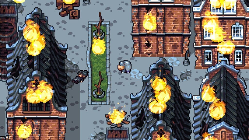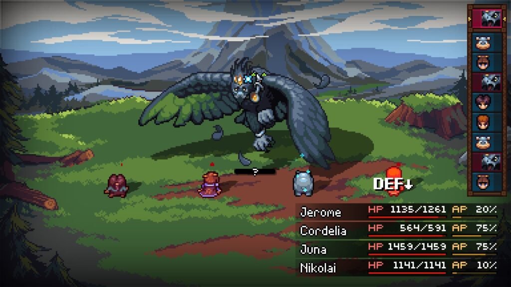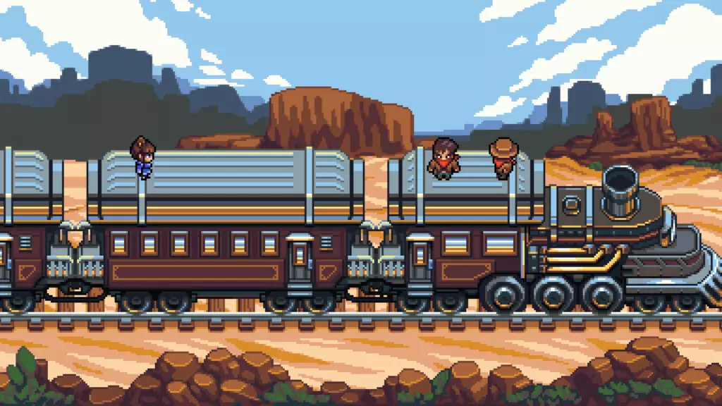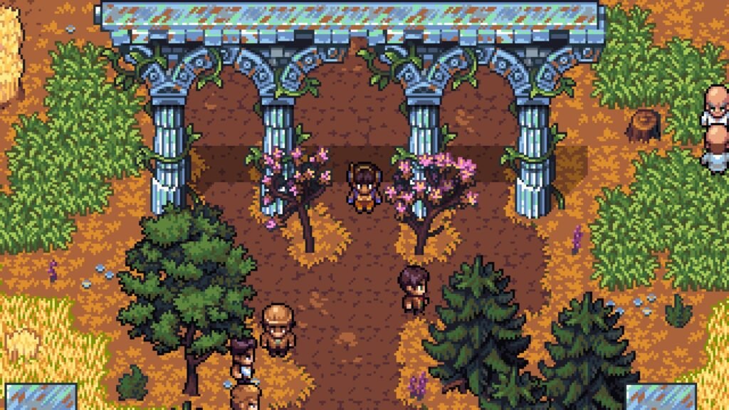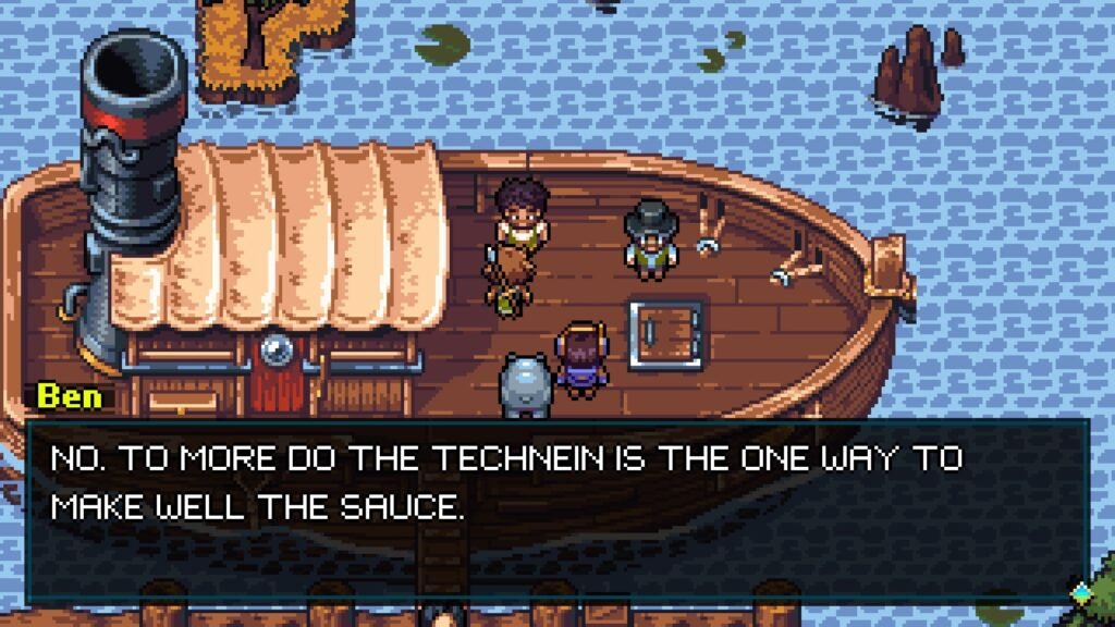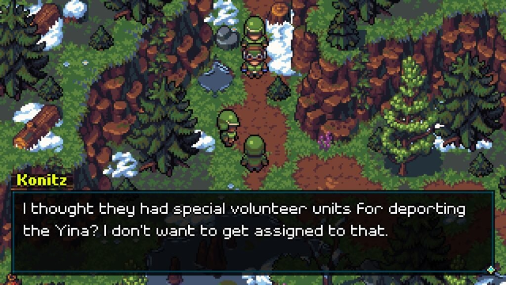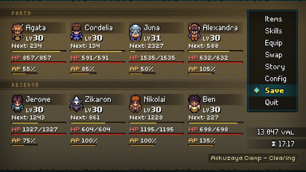 Pour autant, si votre exigence sur ce que doit être un bon jeu de rôle n’est pas trop boursouflée, Quartet reste agréable à parcourir. De la même manière qu’il est agréable d’en arpenter ses décors, taillés dans un pixel-art qui évoque, comme nous le disions auparavant, Final Fantasy 6. On retrouve d’ailleurs ce mélange équivalent de technologie et de magie, ainsi qu’un empire Auslen qui rappelle, jusque dans son identité visuelle, celui de Gestahl. On demeure plus réservé sur la bande originale déployée par Something Classic. Pas mauvaises en soi — certains thèmes restent chouettes à écouter —, les pistes musicales souffrent de leur petitesse, et finissent par taper sur le système. L’autre problème, c’est qu’elles ne sont parfois pas du tout adaptées à la mise en scène. Un air jazzy dans un village barbare, mouais, une mélodie joyeuse alors qu’un assassin surgit pour faire la peau d’un protagoniste, bon…