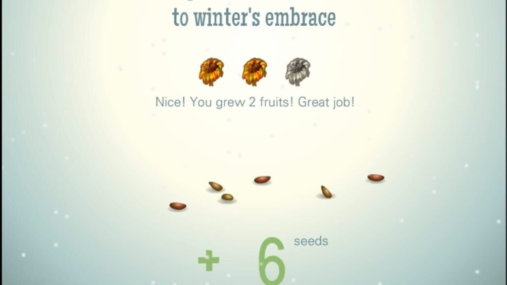 Cette accroche de paragraphe est parfaite car elle définit tout à fait ce qu’est Reach for the Sun. Le jeu nous propose de faire pousser quatre types de plante à la difficulté différente. Le but du jeu est simple : vous possédez trois ressources que sont l’eau, les nutriments et la chlorophylle. Vous avez votre petite pousse en début de jeu a laquelle vous pouvez ajouter des racines suite à l’obtention d’eau. En cliquant sur les racines, vous obtenez de l’eau et des nutriments, qui vous permettent (toujours en cliquant dessus) de nourrir les feuilles de votre plante. Ces feuilles vous amènent de la chlorophylle nécessaire… À la création de racines, de fleurs et de branches. La boucle se boucle et la magie de la nature fait le reste. Scientifiquement parlant, c’est idéal pour les enfants car tout est très bien expliqué. Dommage que ce soit en anglais ! Mais si vous êtes à côté du marmot, nul doute que vous pourrez lui expliquer en passant le tutoriel. Passé l’apprentissage, qui ne dure pas longtemps, le jeu se fait aussi bien en anglais qu’en français ou en croate puisqu’il n’utilise que très peu de texte. Une fois que vous avez votre pousse, vos feuilles, vos tiges, vous pouvez faire une fleur. Cette fleur générera du pollen qui devra être produit trois fois de suite pour ensuite avoir le droit de produire un fruit. Enfin, le fruit est un des objectifs de la partie. Avant l’hiver, à la mort de votre fleur, vous devrez réussir à faire le plus de fruits possible et les voir mourir pour en obtenir des graines.