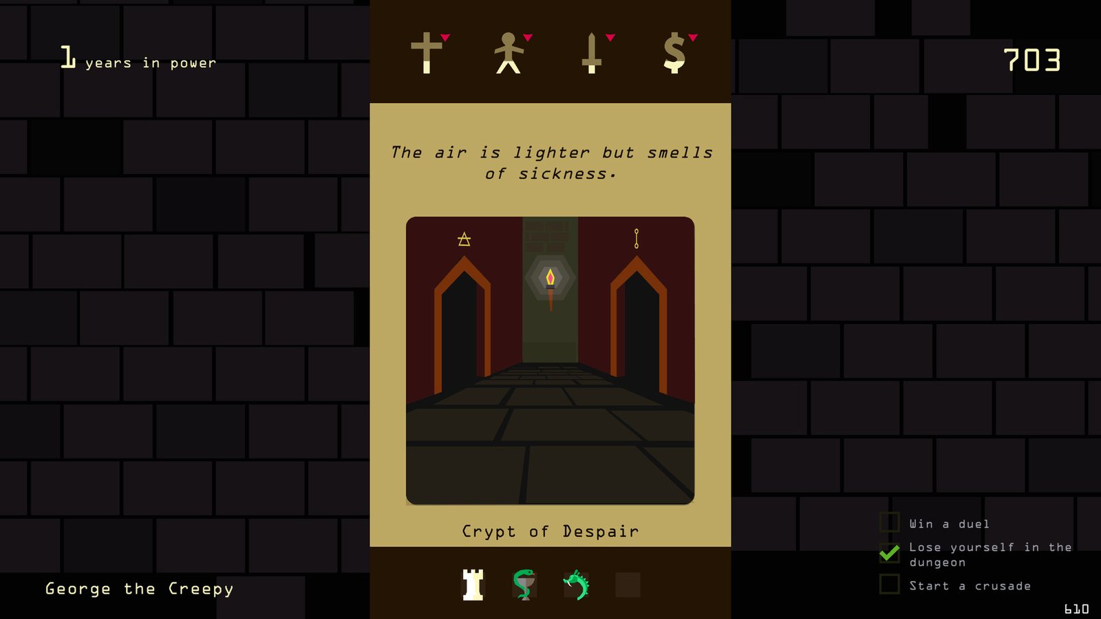 Monseigneur, rien ne va plus. Il faut réussir à contenter tout le monde : l’église, vos fragiles villageois, l’armée et votre trésorerie. Mais voilà, il y a la guerre qui frappe aux portes de nos royaumes. Quand à ce médecin et ses expériences bizarres, il ne me fait pas confiance. Vous voulez vraiment améliorer le toit de l’Eglise ? Est-ce bien nécessaire de dépenser pour cela ? Attention, vous êtes dans le rouge ! De l’argent en moins et c’est la révolte… Messire… Que fait votre tête au sol, décrochée de votre corps ?