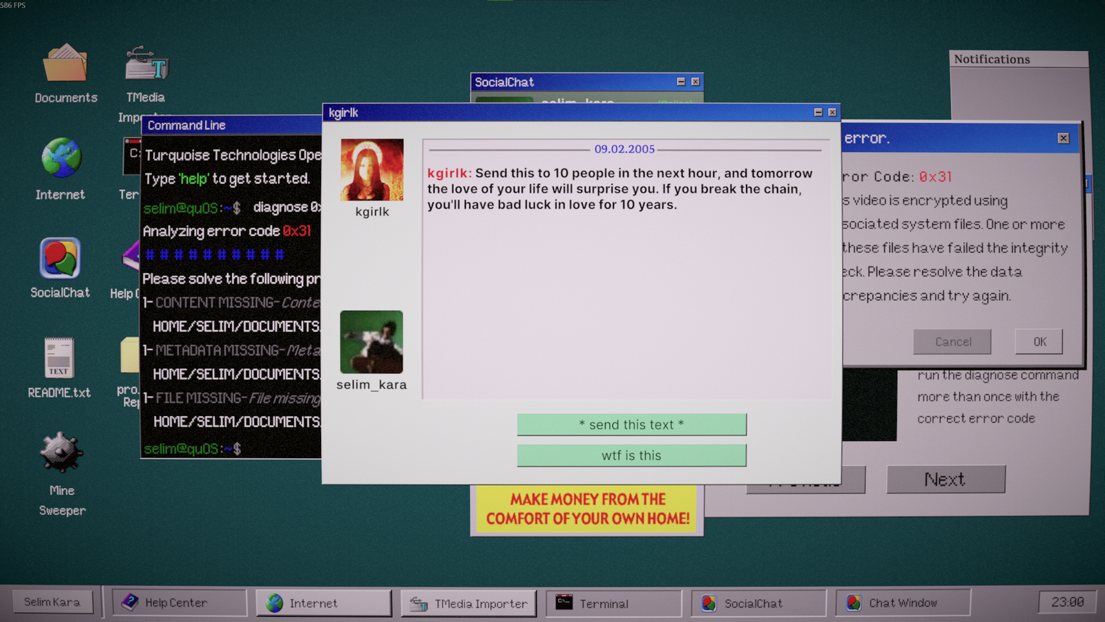 Heaven Does Not Respond est un jeu d’enquête horrifique dans lequel on navigue dans un ordinateur fonctionnant sous un OS rappelant Windows 98. Forcément, on y trouve de nombreux clins d’œil qui devraient titiller la partie nostalgique de votre cerveau. On aura par exemple le droit à une fenêtre MSN surgissant avec comme message une incitation à faire suivre une chaine si vous ne voulez pas vous retrouver maudit sur quinze générations. Ah… la belle époque.