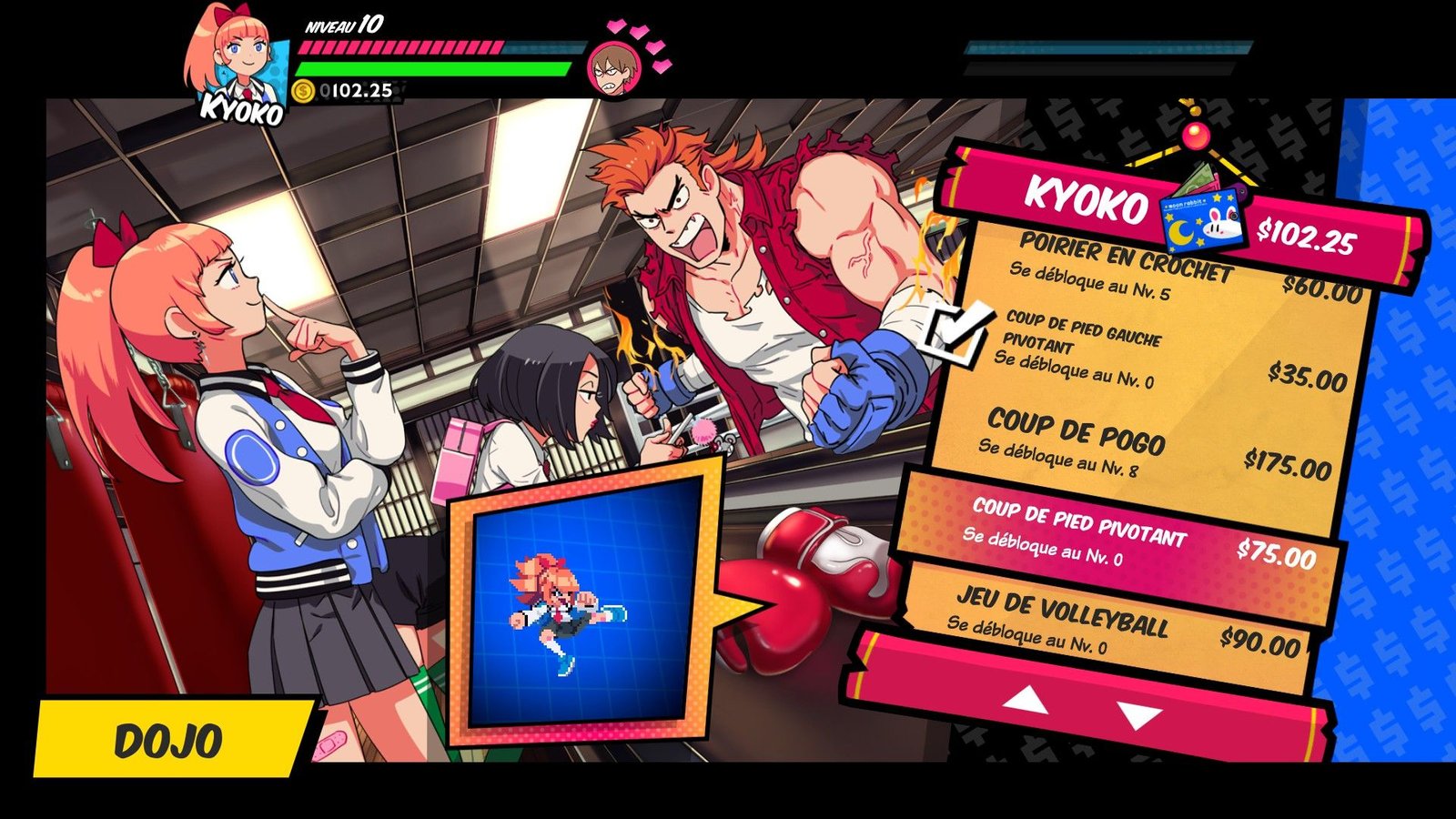 La première va avoir un style de combat en rapport avec le volley-ball et le breakdance (avec le fameux dab) alors que Misako va avoir un style plus football et Double Dragon, reprenant à son compte quelques coups des frères Lee, et les bruitages qui vont avec. On pourra acheter avec l’argent récolté sur les ennemis des coups et combos dans un dojo tenu par Billy Lee (ou Jimmy Lee) ou encore, dans des magasins répartis un peu partout des accessoires dont on peut s’équiper mais un peu anecdotiques et des victuailles permettant de récupérer de la vie et d’améliorer nos caractéristiques lors de leur première utilisation.