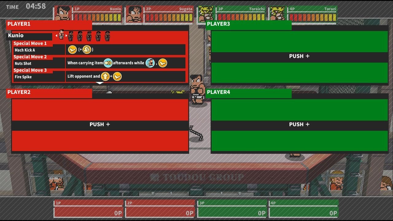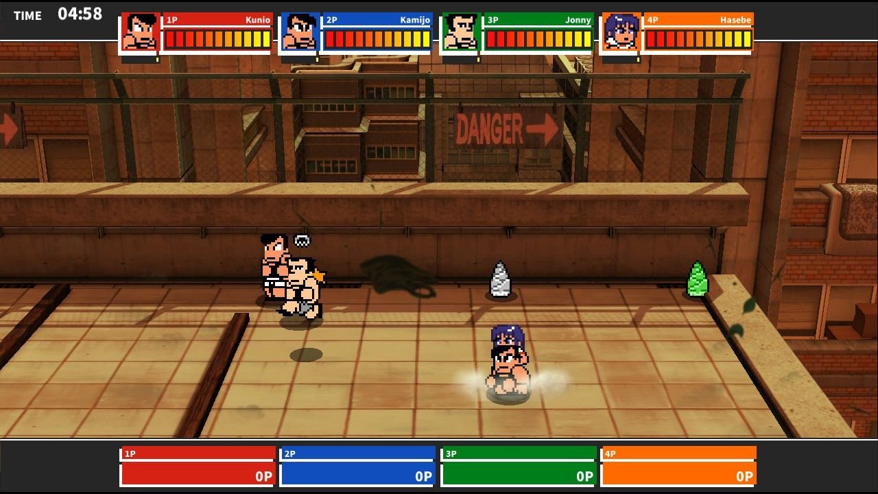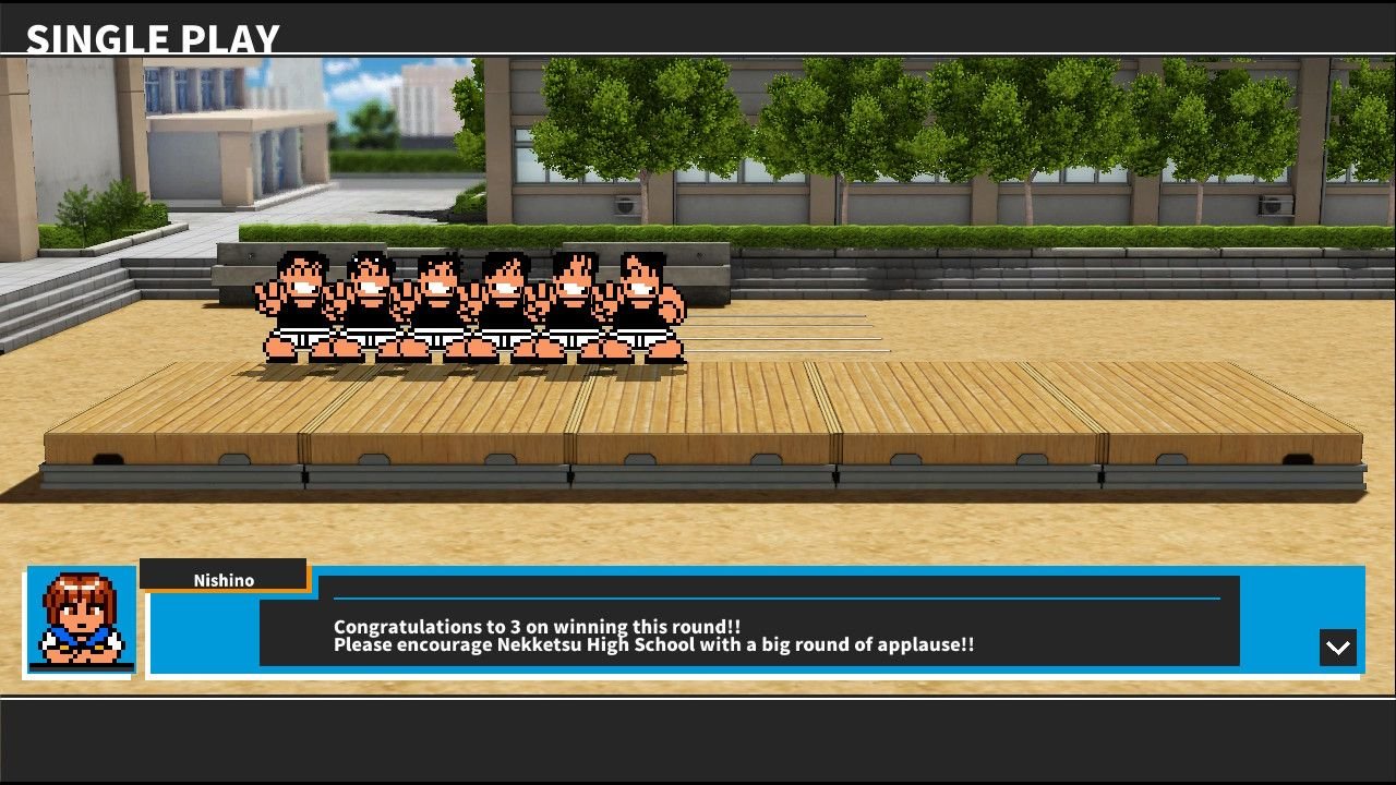 Ce qui m’amène à River City Mele Mach (RRCM) qui est au final une version uniquement battle royale dérivée de River City Super Sports Challenge ~All Stars Special~ (sorti fin 2015), où les différents lycées de l’univers du jeu se mettent la misère sur fond de compétition sportive variée. parmis ces épreuves il y avait une épreuve de baston à quatre et c’est donc de cette épreuve, et uniquement celle-ci que découle River City Melee Mach.