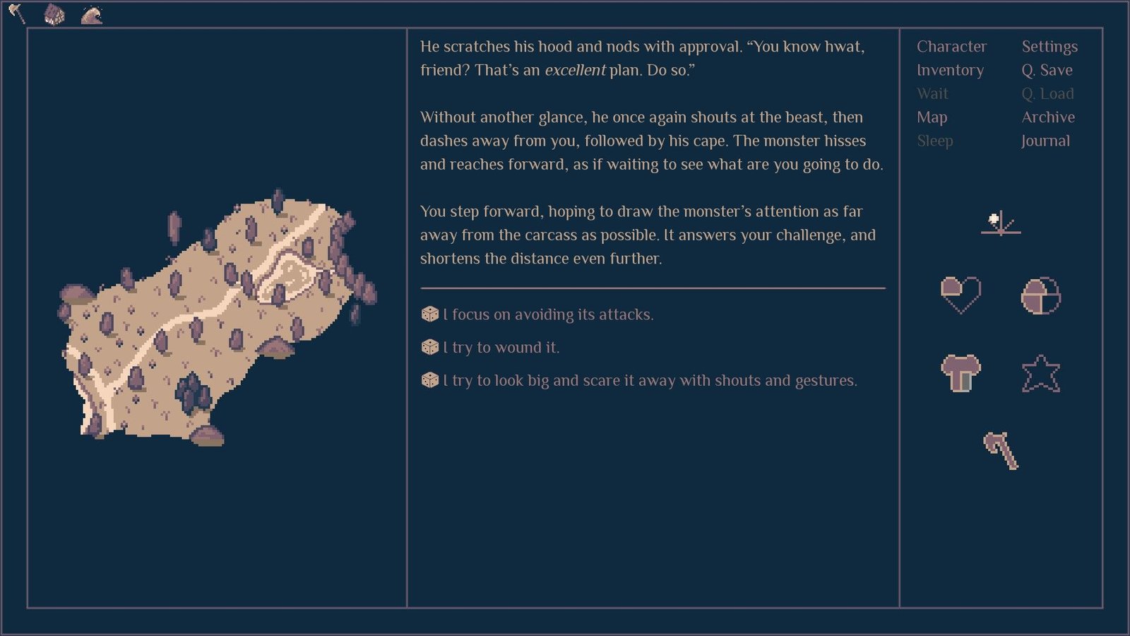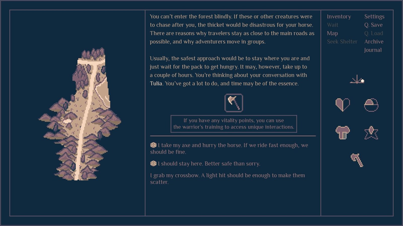 Si la mécanique est solide, les interactions sont toutefois limitées. Et c’est là qu’intervient Roadwarden . Ce dernier reprend exactement les mécaniques des livres dont vous êtes le héros, en supprimant les notions de chapitres (remplacés par une interface classique où vous viendrez directement choisir vos actions) et surtout en apportant beaucoup plus d’interactions et de liberté dans l’avancement de votre aventure. Vous incarnez un Roadwarden , que l’on pourrait traduire comme étant un mélange de garde forestier des chemins mélangé à Lisa de La Poste. Votre job consiste à sécuriser les routes et à délivrer des messages entre les divers villages du coin.