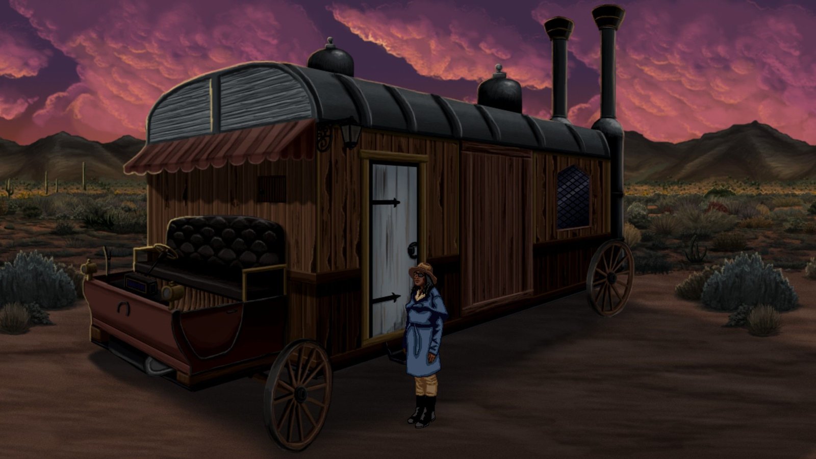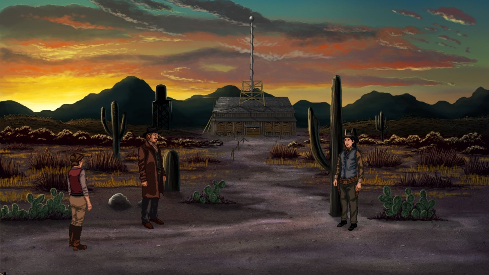 C’est d’ailleurs ce qui surprend le plus dans ce Rosewater , le rythme et découpage de l’intrigue. Si l’aventure commence assez classiquement, en termes de game designProcessus de création et de mise au point des règles et autres éléments constitutifs d'un jeu , la suite et le voyage à travers le West Vespuccia est lui assez différent de ce que l’on peut attendre habituellement d’un Point & ClickSous genre du jeu d'aventure graphique popularisé dans les années 80s/90s, généralement contrôlé à la souris. classique. Ce deuxième chapitre est en effet très découpé, laissant de côté quasi complétement l’histoire principale pour se concentrer sur le développement du background des membres de votre groupe ainsi que vos relations avec eux. À chaque arrêt, vous tomberez sur un évènement semi-aléatoire (dans le sens ou d’un runUne partie intégrale ou une tentative de terminer un jeu vidéo à l’autre, l’ordre peut changer ou vous aurez des évènements différents), sous forme de mini-aventure avec sa propre histoire, sorte d’épisode stand alone comme dans les séries des années 90’s-2000. Vous tomberez par exemple sur un excentrique construisant un château pour sa prétendante qu’il n’a pas vu depuis six ans, traquerez des bandits pour venir en aide à un député shériff, et pourrez même vous transformer en archéologue l’espace d’un instant. Le principal intérêt de ces mini-épisodes, est qu’ils ont tous des résolutions différentes possibles selon vos actions et choix, et, de ce que j’ai pu en conclure, vont ainsi façonner petit à petit vos relations avec vos compagnons, tous superbement interprétés au passage, et ainsi en partie affecter la suite des évènements dans le dernier chapitre du titre.