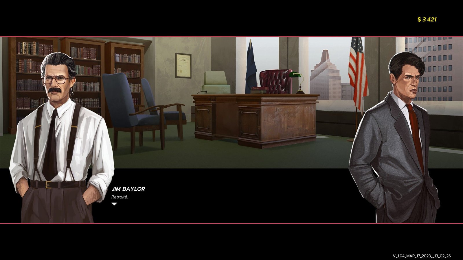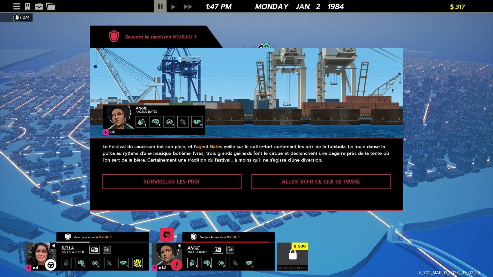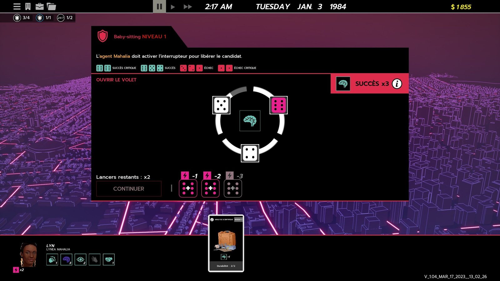 On notera que les déplacements de la caméra sur la carte sont assez désagréables à l’utilisation. Ils se font principalement à la souris, le jeu ne semblant pas gérer le ZQSD et montrent un léger lag et il est surtout impossible de dézoomer.  Mais le plus gros défaut de Rough Justice ’84 reste au final sa trop grande répétitivité, avec une boucle de gameplayOu « jouabilité » en français, fait référence à la façon dont le joueur interagit avec un jeu vidéo. qui atteint ses limites beaucoup trop tôt. Le jeu ne vous offre que très peu de possibilités de stratégie. Vous choisissez vos types de missions, votre équipement, assez limité, vos agents et augmentez de temps en temps leurs stats là où ils sont déjà forts car il vous faudra de toute façon les spécialiser pour passer les épreuves de dés plus difficiles. Et c’est là le problème, le système très basique d’épreuve n’évolue vraiment jamais, sauf à vous demander plus de réussites et donc d’avoir plus de dés. La véritable boucle de gameplay revient donc à… « grinder ». Vous répéterez la même chose encore et encore pour gagner en expérience (agents et responsables de missions) pour réussir des épreuves plus compliquées et débloquer un bout d’histoire… et c’est tout.