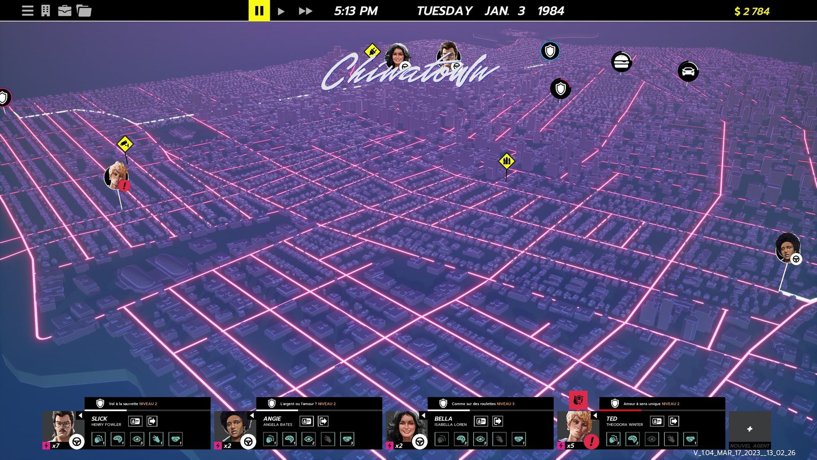 Autre gros point noir, il est impossible d’annuler un ordre donné sur la carte. Donc si on assigne une mission à un agent, et qu’un point d’intérêt apparait pendant son trajet, comme un bonus ou une mission spéciale, il est impossible de lui faire changer de destination, voire même de s’arrêter sur le chemin. Ce qui n’a aucun sens vu que l’on ne peut pas savoir à l’avance quel évènement aléatoire va apparaitre sur la carte et ce qui prive donc le joueur d’une possibilité de gestion en plus… vraiment frustrant. Reste un habillage global plutôt réussi. L’ambiance années 80 est bien là, le design des personnages est plutôt réussi, et la musique bien adaptée au contexte, même si elle devient un peu répétitive elle aussi.