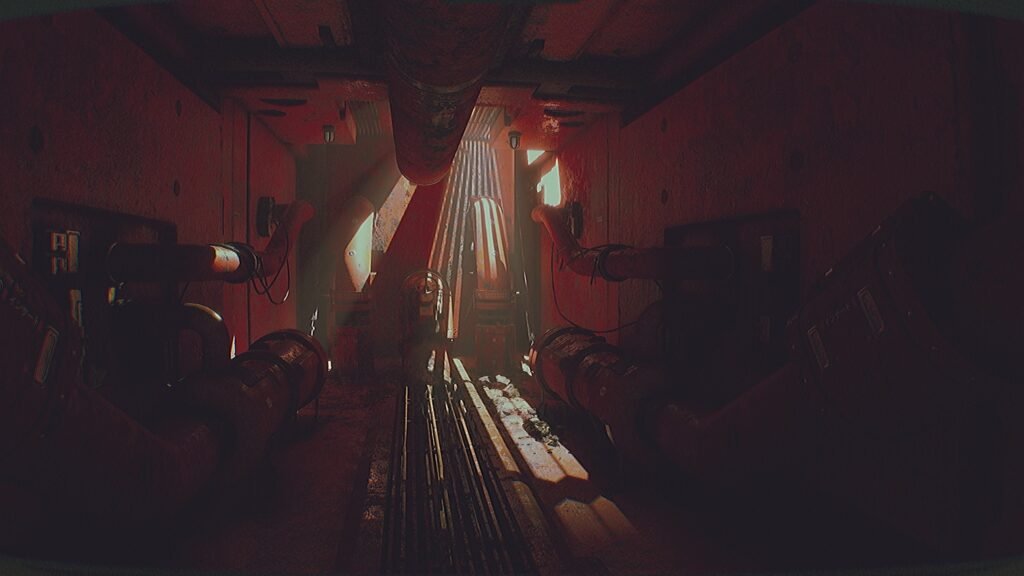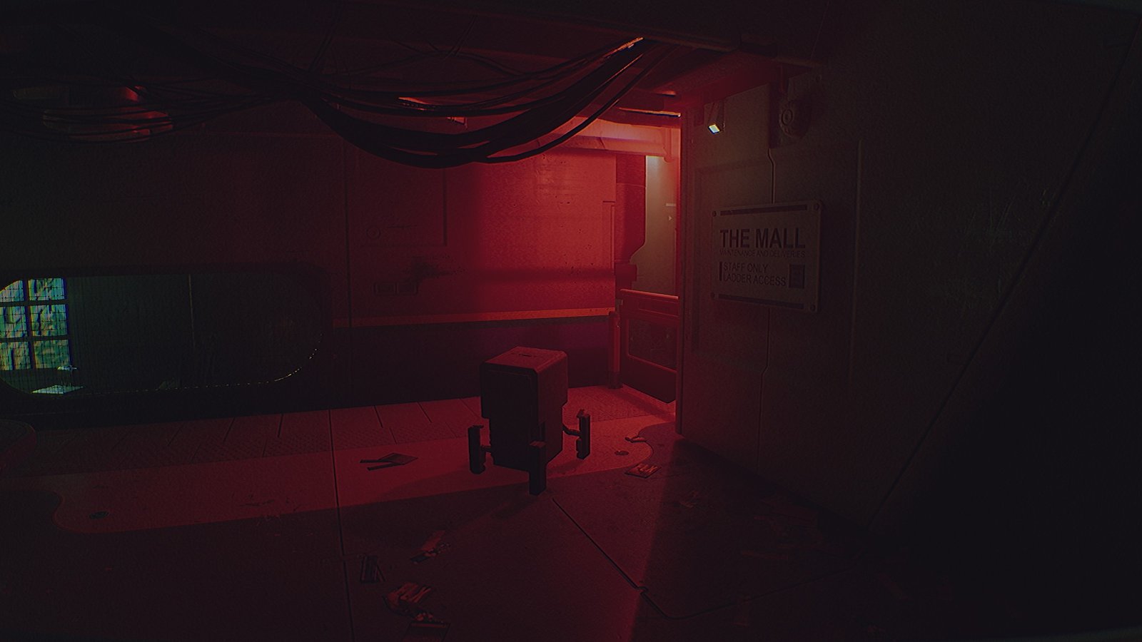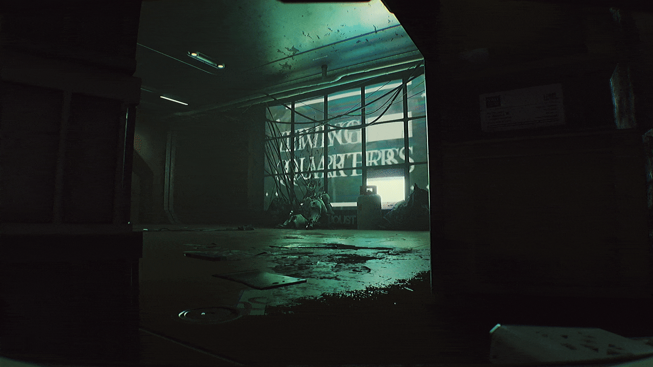 C’est marrant parce que le jeu est passé par tout un tas de phases dans son développement. Il devait être un Dear Esther angoissant sur la Lune, puis des notions de gun play, de rogue-like et de permadeath se sont greffées, donnant une « routine » de gameplayOu « jouabilité » en français, fait référence à la façon dont le joueur interagit avec un jeu vidéo. et donc beaucoup de sens au titre. Depuis, c’est devenu un jeu d’horreur à ambiance, où l’on incarne un technicien envoyé sur une station sur la Lune qui ne répond plus. Dès les premières minutes, le souffle est coupé. La lumière est faible, les couleurs semblent délavées, tout semble à l’abandon et votre terminal est un écran cathodique grossier mais fonctionnel. On lit les mails automatiques de bienvenue, on comprend qu’on a maintenant un identifiant attaché et nous voilà sorti dans cette station lunaire fantôme. Tout est resté au milieu, en suspens, comme si les gens avaient disparu en une fraction de seconde. Les lumières fonctionnent mal, on y voit très peu et, ironie du sort, aucune lampe torche ne semble avoir été livrée avec notre paquetage.