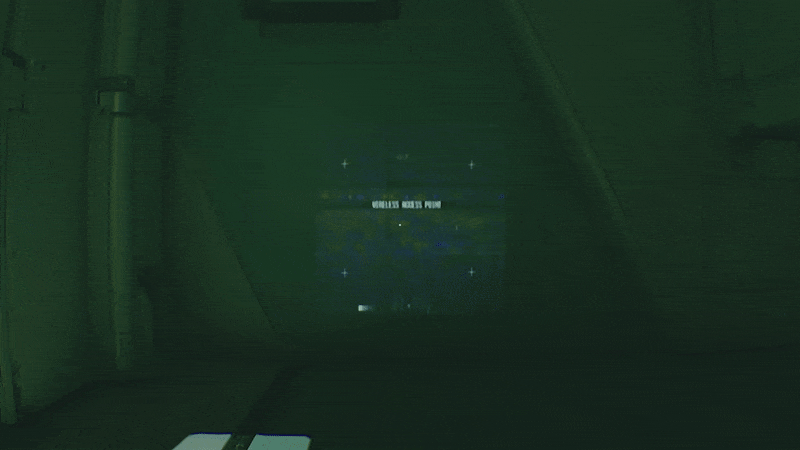Si je passe autant de temps sur cet outil, c’est déjà parce qu’il est trop cool, mais en plus, il représente parfaitement la volonté des développeurs d’avoir un univers cohérent, loin du futur trop propre, et surtout, il met très en avant l’intradiégétique. Oui, le « I-word » a encore été prononcé dans un texte par moi, mais que voulez-vous, je suis naturellement attiré par ça, et ROUTINE est fondée sur ce principe. Par exemple, pour afficher le menu du jeu qui contient votre journal de quête, les documents importants pour avancer, ou les informations sur votre C.A.T., il faut trouver un point d’accès wifi, appuyer sur le bouton de connexion sur votre outil, et le voici qui se projette sur le mur.