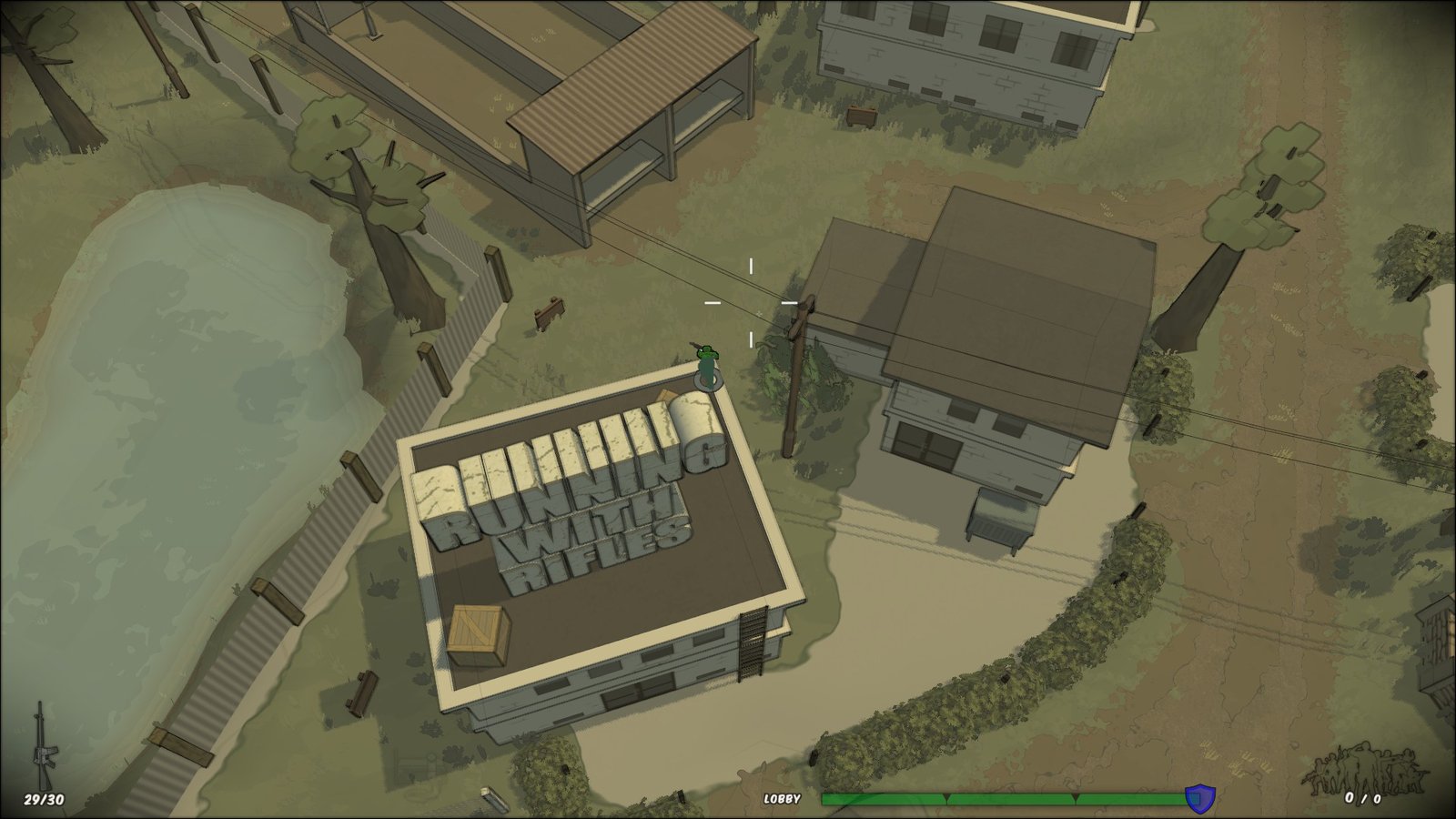 Vue aérienne et viseur mobile en évidence, Running With Rifles se contrôle comme un top down shooter assez classique, au clavier et à la souris. Malgré la nature assez violente de ce type de jeu, il arrive à en désamorcer tout reproche éventuel en se moquant de lui-même. Il se distance ainsi du côté meurtrier de ce type de simulations guerrières pour n’en garder que l’essentiel, c’est-à-dire l’aspect tactique et le tir aux pigeons.