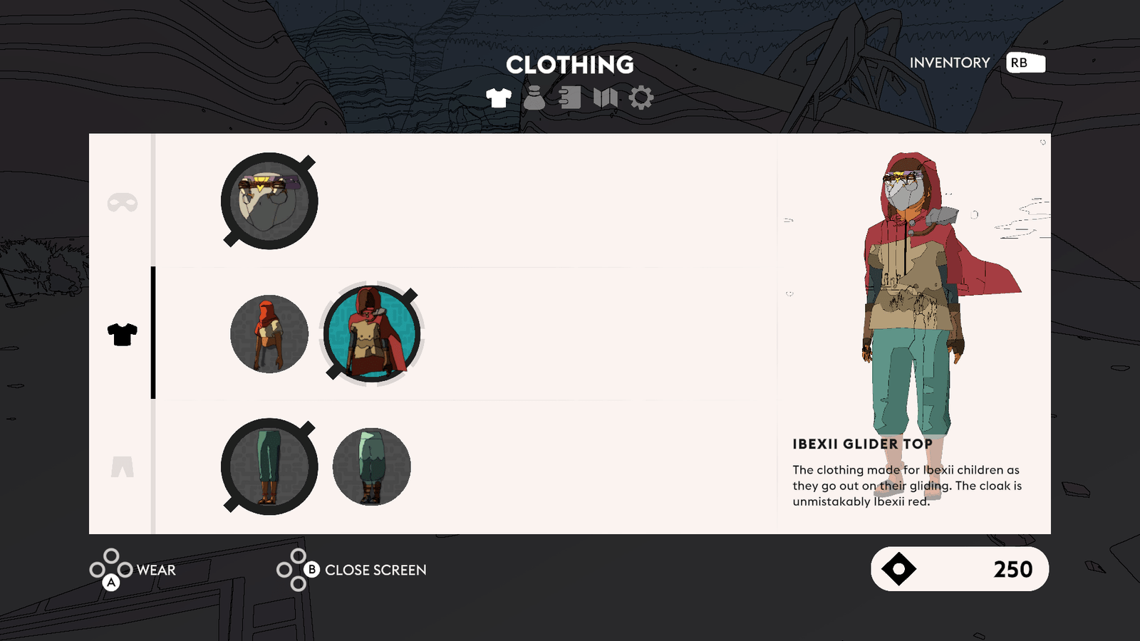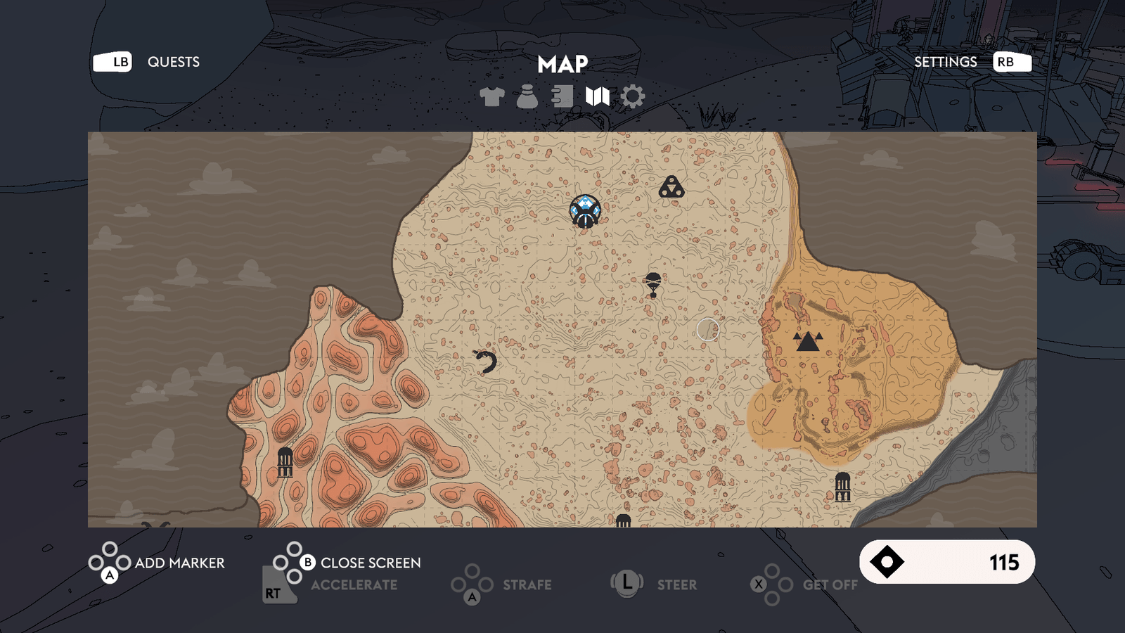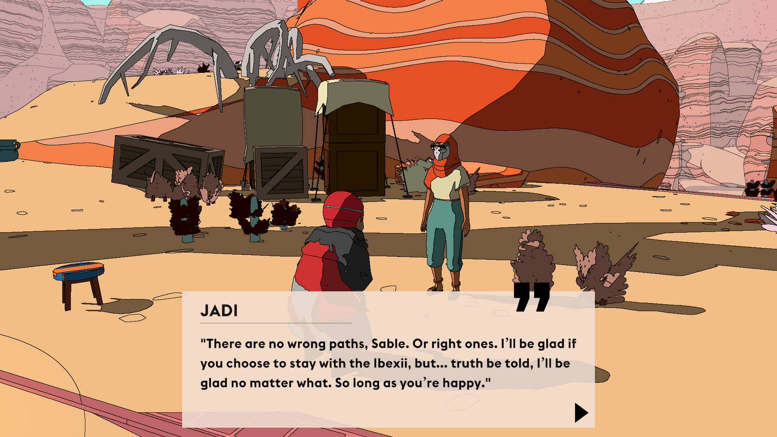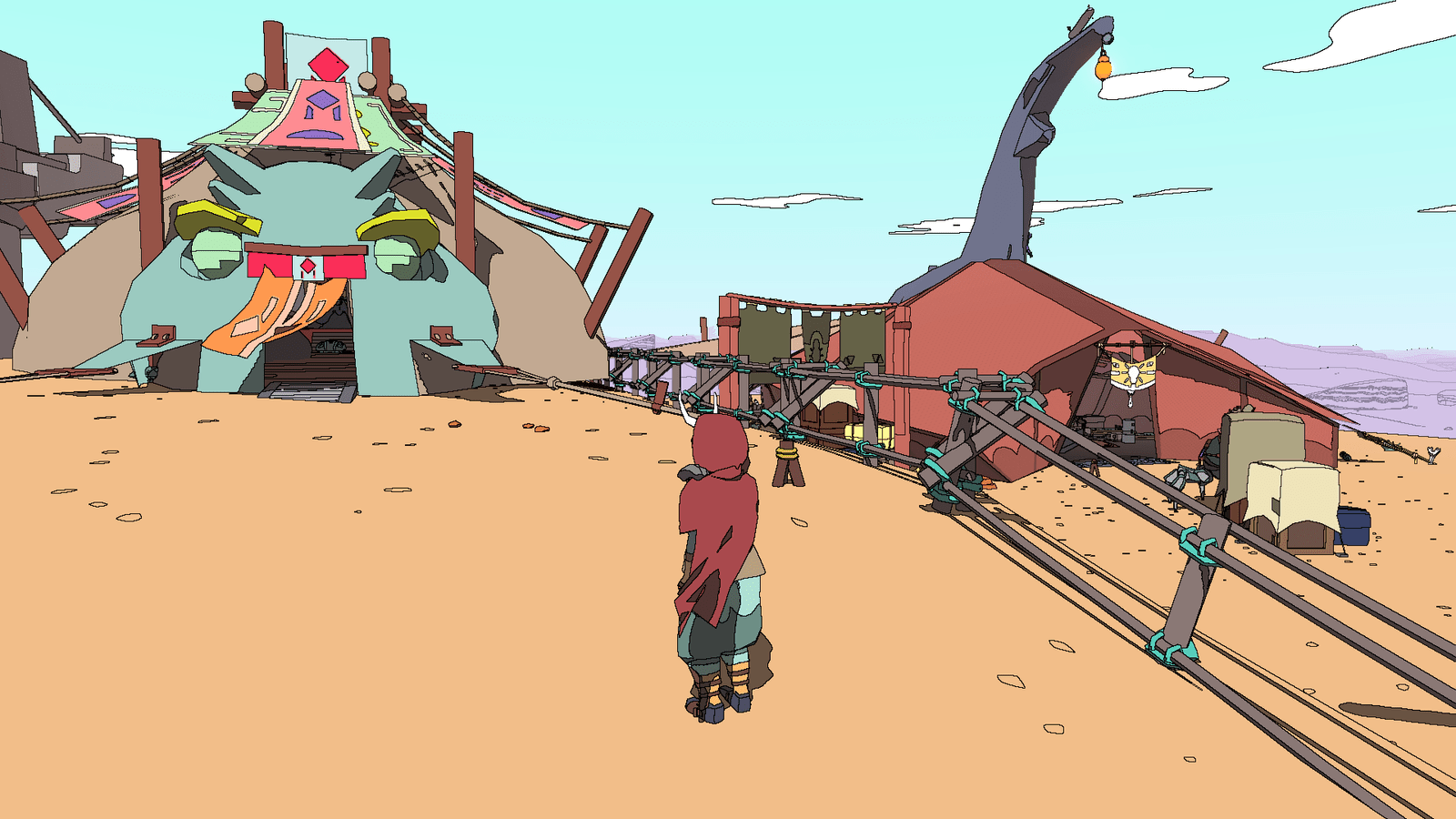 Une seule quête principale régit Sable : réunir suffisamment de masques – qui définissent l’identité et l’essence de leur porteur – comme autant de récompenses après avoir aidé les habitants du monde de Midden, afin de pouvoir choisir soi-même sa destinée et terminer son voyage initiatique. Comme dans le dernier Zelda en date, le joueur peut se rendre aux premiers endroits conseillés ou bien partir à l’opposé, traverser les dunes au guidon de l’aérocycle et rejoindre les points d’intérêt qui se découpent à l’horizon : ballons flottants de cartographes – qui fournissent une carte de la région moyennant finances – ruines majestueuses à explorer, villages/campements de donneurs de quêtes et épaves massives de vaisseaux spatiaux échoués. Rejoindre un personnage au sommet d’un pont titanesque, résoudre des énigmes dans des temples antiques ou se livrer à l’exploration des entrailles de monstres de métal pour découvrir les secrets du monde mysticodésertique de Midden, toutes ces méthodes sont bonnes pour trouver sa voie dans Sable. Des badges pourront être collectés selon les mystères révélés et les quêtes accomplies – malheureusement très axées sur le système « va me chercher ça s’il te plaît tu seras bien gentille car je suis trop fainéant pour le faire moi-même » -, et être utilisés pour fabriquer les précieux masques cités plus haut, qui permettront de voir la fin de l’aventure lorsque le joueur le décidera, à savoir quand il considèrera avoir fait suffisamment le tour du monde et de ses secrets.