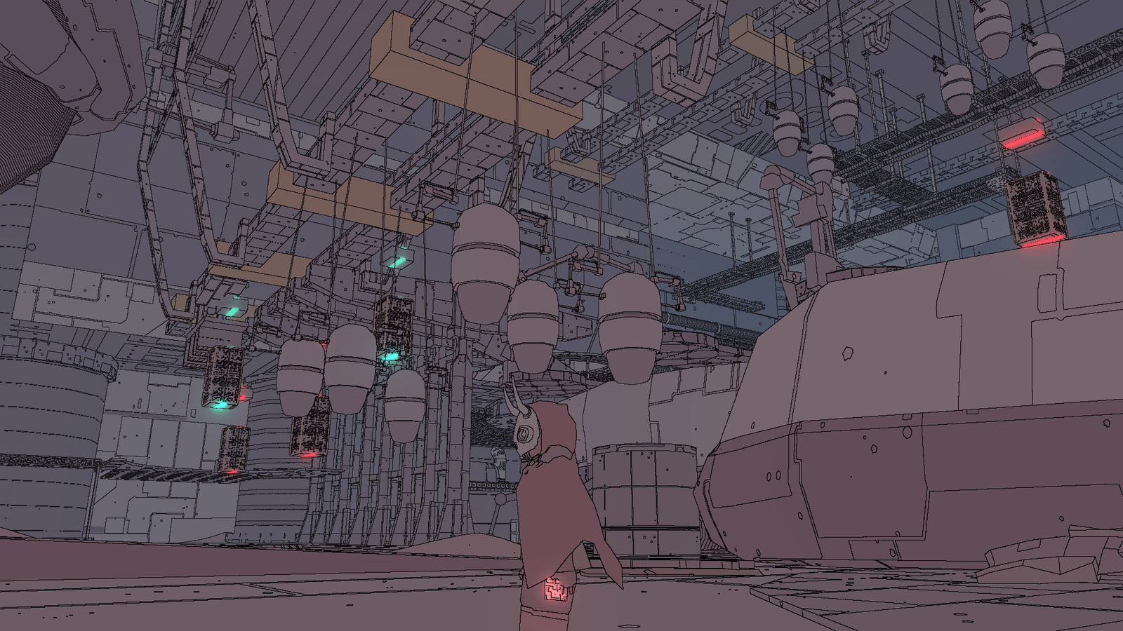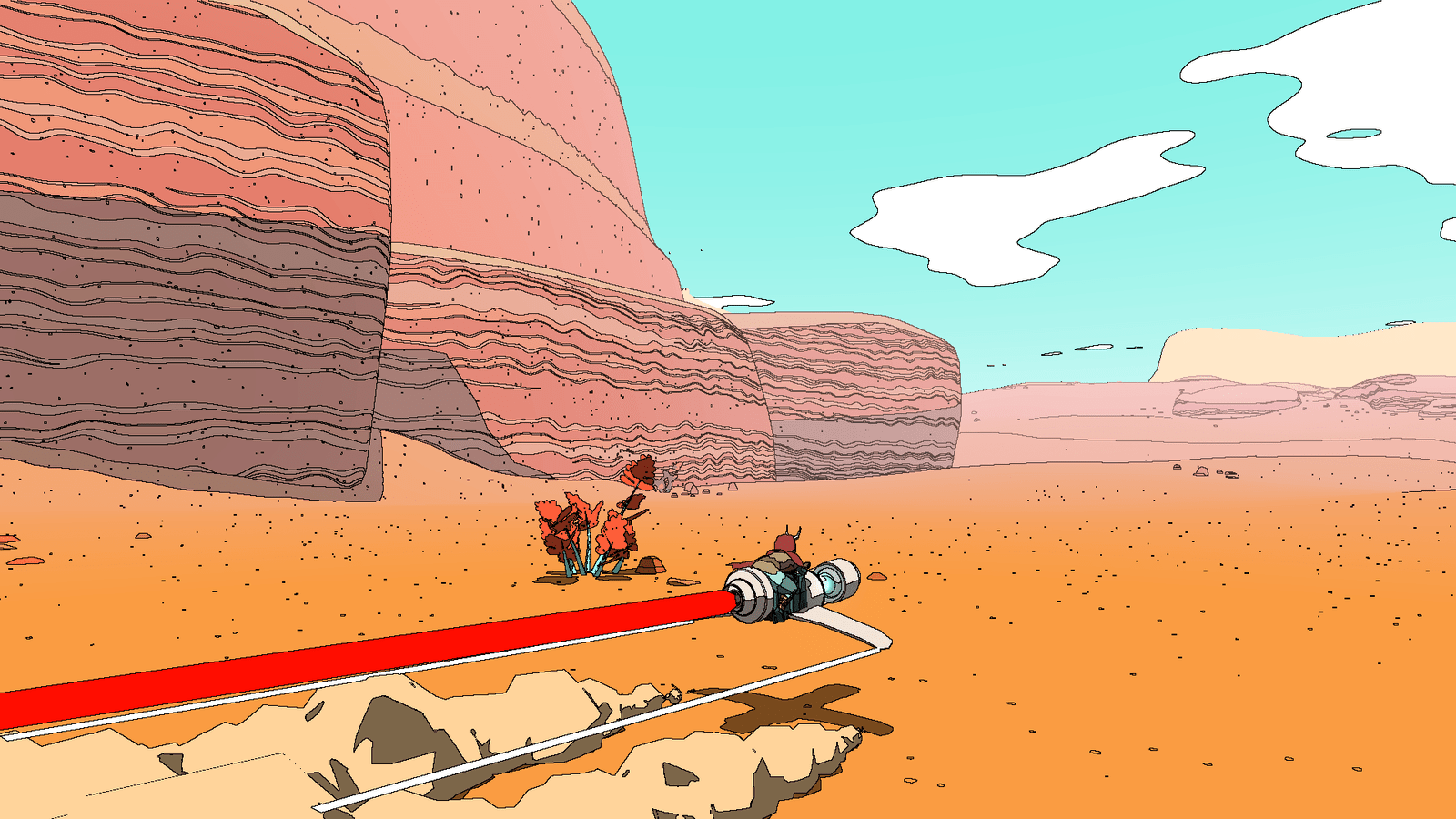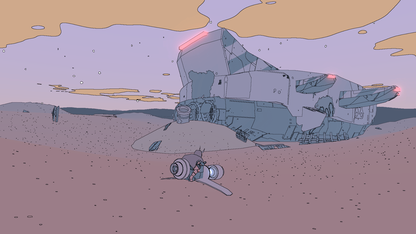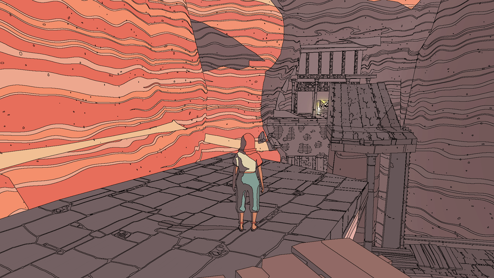 Si Sable offre une ouverture bienvenue dans son déroulement et quelques quêtes rébarbatives, c’est avant tout pour servir son incroyable direction artistique et le charme magnétique que dégage le moindre point de vue sur Midden. Le trait influencé par Moebius vibre à chaque mouvement, l’animation saccadée de Sable accentuant l’effet « bande dessinée qui prend vie ». Forêts pétrifiées, paysages arides, villes antiques et canyons ombragés saisissent l’œil, d’autant que le cycle jour/nuit permet de redécouvrir sous un autre angle le moindre recoin et panorama. Sable s’apprécie lorsqu’on attend le lever du Soleil et que l’on suit le mouvement des ombres, la course des nuages se dessinant sur le sol ou encore lorsque l’on scrute l’horizon battu par les vents, guettant les lueurs rouges des mastodontes de métal à réveiller. La moindre escalade, le moindre voyage en moto est récompensé par des points de vue aux couleurs pastels, des cieux hypnotiques ou des architectures aux perspectives immenses qui vous donneront très vite envie de changer votre triste fond d’écran, et de filer découvrir la prochaine merveille, le prochain vaisseau à ranimer ou mausolée à exhumer. L’absence d’interface intrusive joue aussi clairement en faveur de la patte visuelle, les informations se limitant à la jauge d’endurance qui s’affiche lorsque l’on grimpe et court, et à une élégante boussole que l’on affiche à sa guise, indiquant direction de la quête, position de la moto et marqueurs placés volontairement par le joueur.