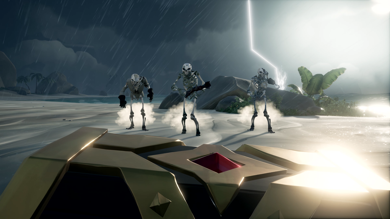 On reprend ? Sea of Thieves c’est de l’apparition sur un avant-poste ou après avoir sélectionné des missions de chasse aux trésors, d’affrontements d’équipages squelettiques ou de capture de poules et cochons, vous prendrez votre bateau. Sur le pont, en équipe, chaque matelot posera sa mission favorite sur la table et tentera de la vendre avant qu’un vote rapide ne destine votre objectif. Ensuite, on sépare les taches : l’un s’occupera de déployer les voiles et de les bouger pour prendre (ou non) un max de vent, un autre s’occupera des canons, de la navigation (en regardant la carte et en indiquant la direction à prendre) ou ira sur la vigie avec sa longue-vue pour jouer les radars humains. Les rôles sont divers, mais on en retiendra trois principaux : celui qui tient la barre, celui qui donne les indications et celui qui tient les voiles et jette et relève l’ancre (avec l’aide de ses comparses pour aller plus vite). C’est donc purement un jeu de coopération, avec micro connecté de préférence, ou l’on passe son temps à récolter des trésors et les ramener en avant-poste pour récolter de l’argent. De la monnaie qui sert qu’à de l’esthétique… Un crochet, une jambe de bois, de nouvelles voiles pour son bateau, etc.