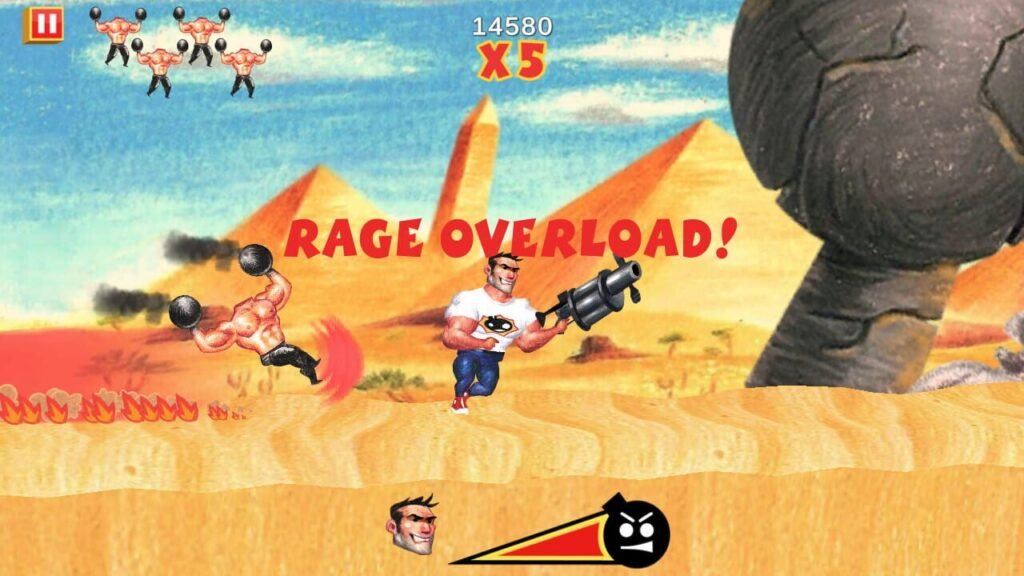 Une fois remplie, vous explosez. Vous avez tout de même un petit temps au ralenti pour vous rendre compte de votre surchauffe et vous calmer un peu sur le tactile. Toutes ces idées de gameplayOu « jouabilité » en français, fait référence à la façon dont le joueur interagit avec un jeu vidéo. se placent alors dans une suite de niveaux à l’objectif principal souvent identique : choper Sam et l’exploser , mais aux objectifs annexes toujours différents. Faire rebondir un animal une trentaine de fois, exploser cinquante cactus, lancer des bombes sur Sam… Les objectifs annexes ne manquent pas et vous rapportent même, en plus d’une bonne position dans les classements mondiaux, des améliorations telles que davantage de vies en début de jeu ou une jauge d’énervement qui chauffe moins vite. Des niveaux spéciaux sont aussi présents, demandant au joueur de poursuivre Serious Sam en lui lançant un nombre déterminé de projectiles à la face avant de pouvoir le faire exploser. Ce sont les niveaux les plus durs. Reste alors, comme dans Lame Castle, un mode Endless (sans fin) et un niveau vous permettant de tenter le record du plus grand nombre de rebonds d’animaux réalisés. C’est très amusant et cela augmente la durée de vie.