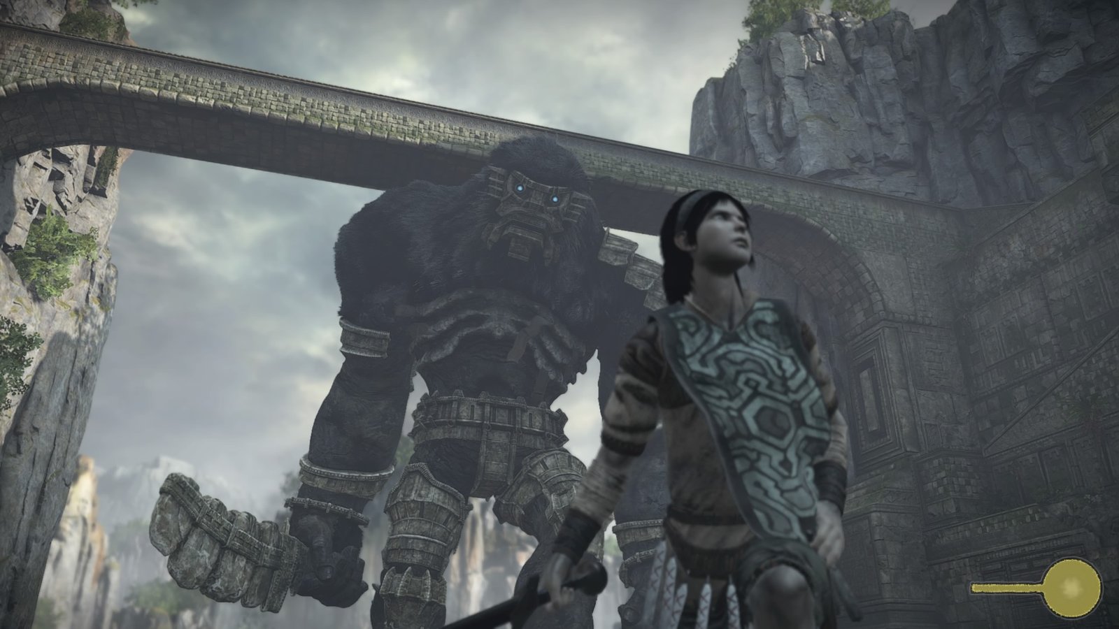 Vous êtes donc Wander et rapidement, vous allez comprendre quelques jolies idées de gameplayOu « jouabilité » en français, fait référence à la façon dont le joueur interagit avec un jeu vidéo. : au soleil, votre épée peut être brandie et vous guidera vers le prochain colosse à vaincre. Vous découvrirez aussi rapidement des fruits, des lézards, des comestibles et collectables qui augmenteront vos deux seules jauges visibles à l’écran lorsque nécessaire : votre vie et votre endurance. Au-delà de cela, rien ne vient s’afficher à l’écran pour vous laisser profiter de tout l’univers proposé. Grande contrée abandonnée, le monde de Shadow of the Colossus vous tend ses bras et une caméra dynamique tentera de vous en montrer les meilleurs angles.