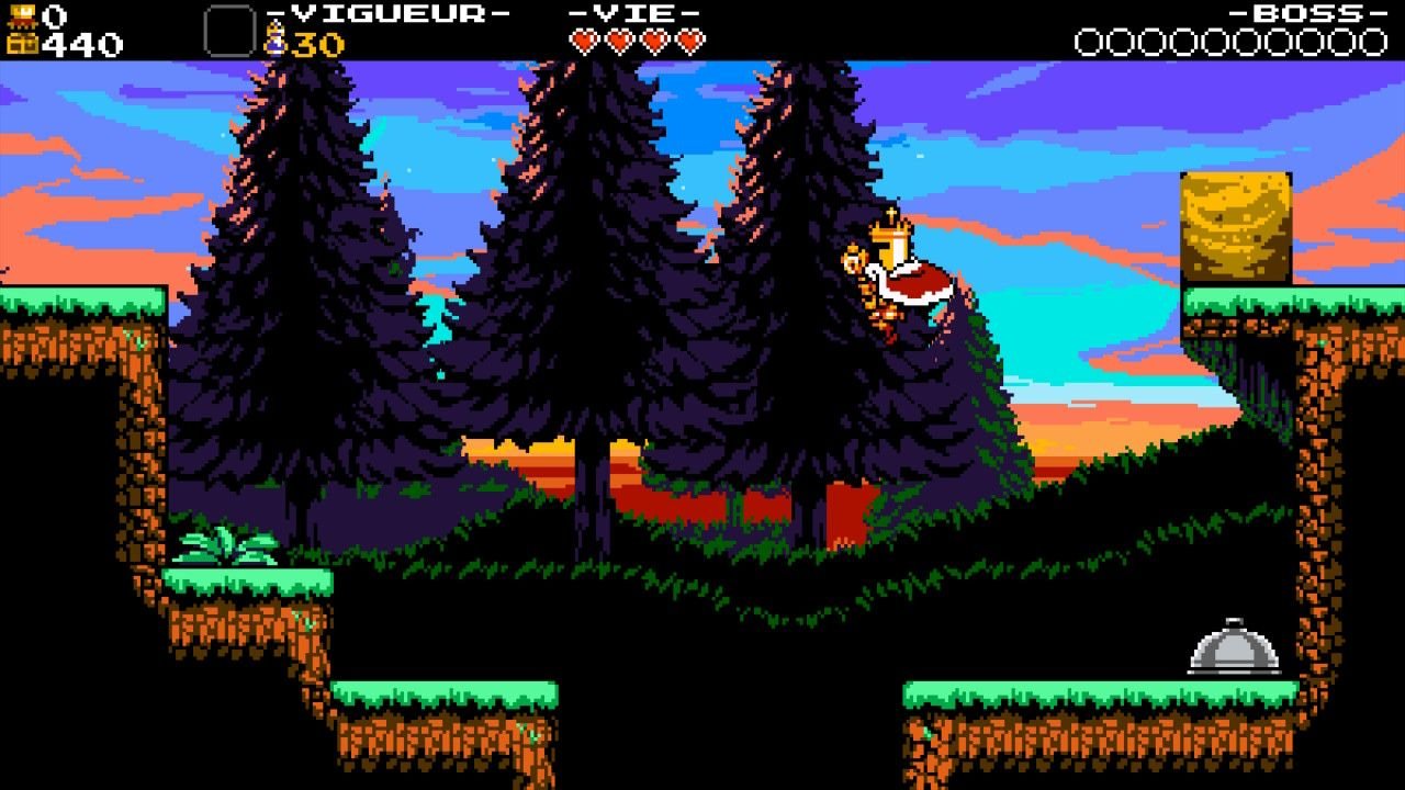 Cette dernière aventure en date donc, la dernière promise sur le kickstarter en tout cas, nous met au commande de King Knight, l’un des boss rencontrés lors de l’aventure principale de Shovel Knight. King Knight est un faux roi vantard et complètement timbré. Mais il aime sa maman qui lui cuisine des tartes, et il s’est mis en tête de devenir vraiment roi grâce au Joustus, un jeu de cartes qui fait fureur dans la contrée. Le but de l’aventure va donc être de parcourir différents niveaux de plateforme, acquérir de l’argent et des reliques afin de battre les maîtres du Joustus. Mais pas forcément aux cartes. Cependant, le jeu existe réellement dans l’univers et même si ses mécaniques sont un peu déroutantes de prime abord, on y prend rapidement goût et il devient assez plaisant d’affronter les différents protagonistes des jeux pour acquérir leurs cartes.