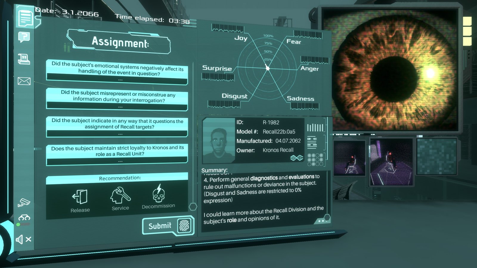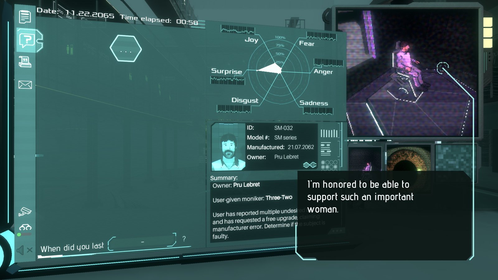 Et c’est là que le jeu est plutôt malin. Il n’est pas très difficile de tirer les vers du nez des interrogés. Il suffit de trouver leur corde sensible, de la tripatouiller, de jauger leurs émotions et le tour est joué, mais simplement, faut-il en apprendre autant ? En effet, l’interrogatoire est intégralement enregistré, et il n’est pas rare que l’empathie foudroie le brave joueur et qu’il décide de relâcher le pauvre hère, alors que le questionnaire indique que ses réponses vaudraient au bonhomme de finir à la déchetterie. Malheur à lui s’il s’exécute, car la punition du conglomérat pourra s’abattre sur lui, puisque cela trahit un comportement déviant. Eh oui, on joue nous aussi une machine ! Toute l’astuce du jeu consiste alors à soutirer les informations utiles, mais pas trop, suivant ce que vous devez retirer de l’interrogatoire. Enfin, après si vous voulez faire du zèle et être un bon petit toutou, c’est possible aussi, et beaucoup plus facile.