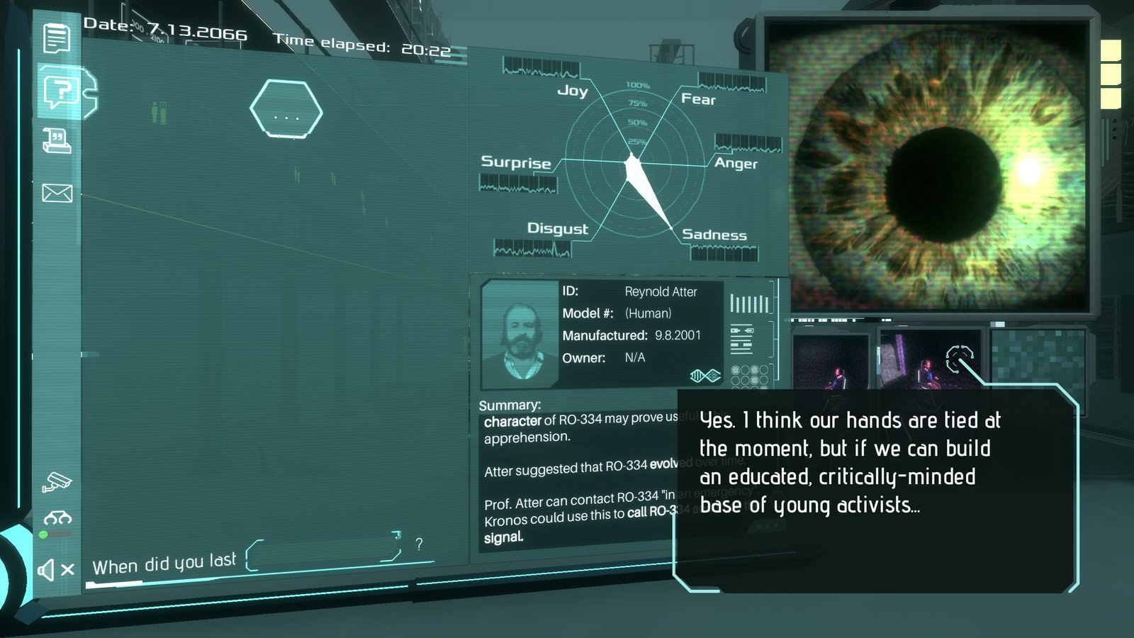 Vous connaissez Blade Runner ? c’est un film où Harrison Ford est un humain chargé de traquer des cyborgs ultra perfectionnés, qu’on ne peut distinguer des humains lambdas qu’avec une observation poussée et un interrogatoire velu. Silicon Dreams nous propose de mener ces interrogatoires mais il y a un twist : on joue un de ces robots indiscernables.