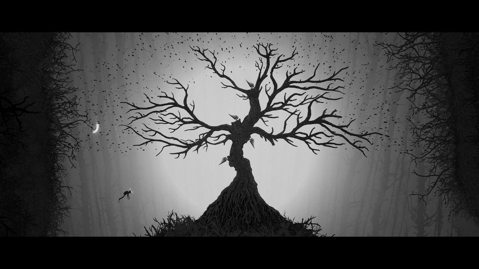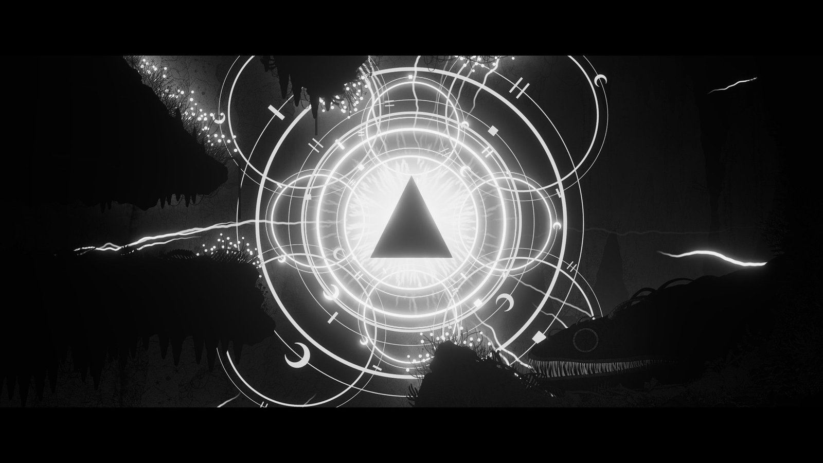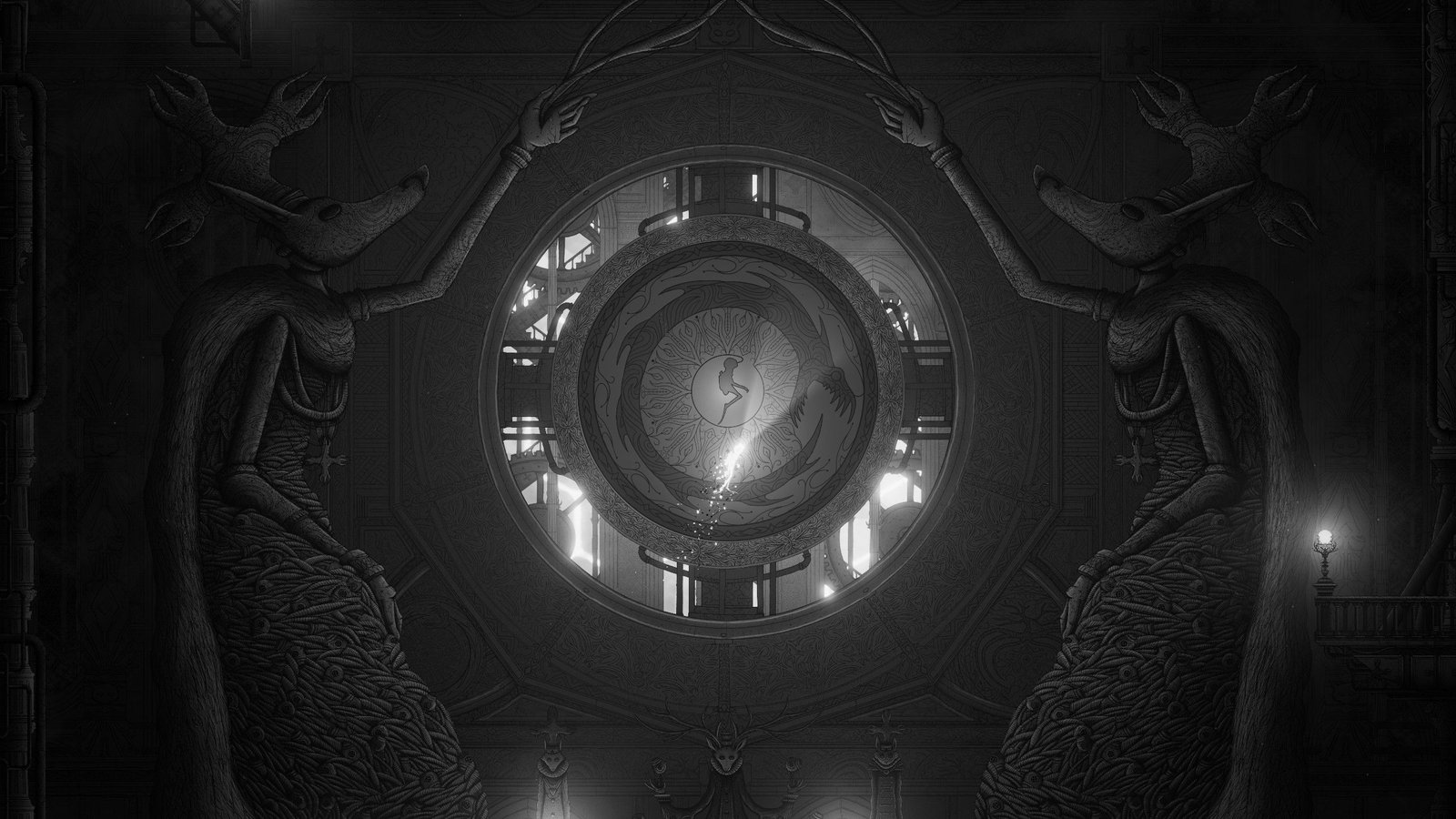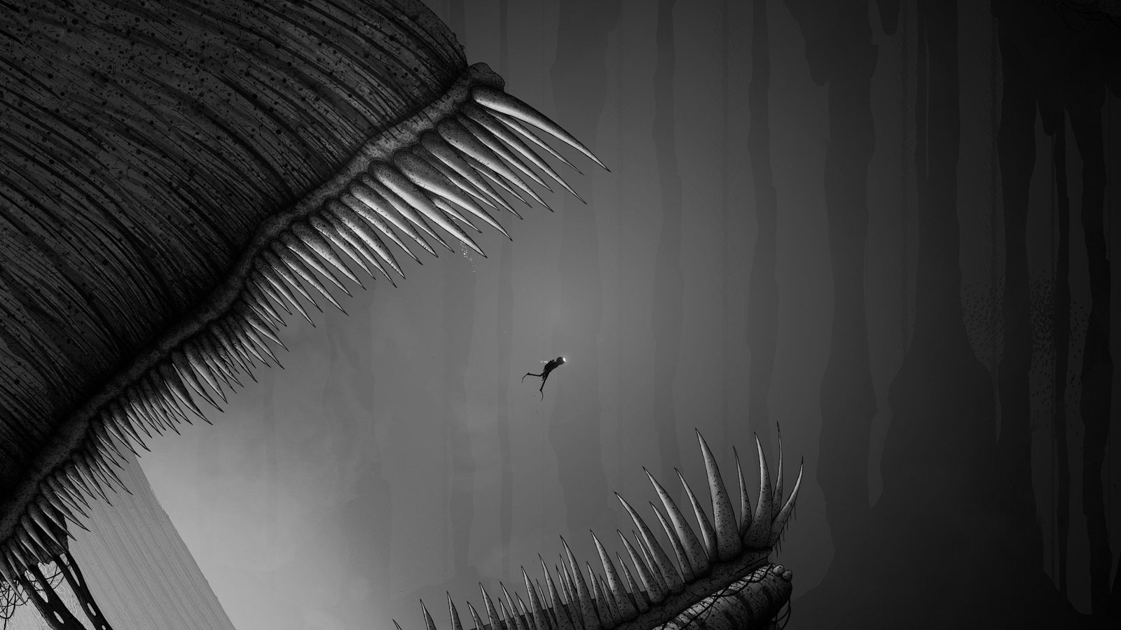 Rien de très compliqué dans les 2 premiers tiers du jeu, les énigmes ont une difficulté très progressive pour vous permettre de bien intégrer les mécaniques de possessions, et les différentes habilités des créatures possédées, et surtout comment vous en servir. Cette relative facilité est d’autant plus bienvenue qu’elle permet surtout de mieux apprécier le côté exploration et découverte du jeu. Car oui, disons le tout de suite, le gros, GROS, point fort du titre est sa direction artistique absolument incroyable. Artistiquement, le choix d’avoir du noir et blanc fonctionne parfaitement avec l’environnement abyssal du jeu, et les dessins du jeu sont tout bonnement magnifiques. En jeu, c’est quasiment une claque à chaque écran de jeu, à l’exception peut être de certains passages en intérieur moins marquants, mais ceux-ci sont compensés par les moments de gigantisme où la caméra s’éloigne pour nous faire mieux profiter des bizarreries de cet univers, à la fois organique et mécanique. À noter que niveau ambiance, il n’y a quasiment pas de musiques en jeu, mais un beau travail sur les sons environnementaux a été réalisé, vous plongeant encore plus dans l’ambiance.