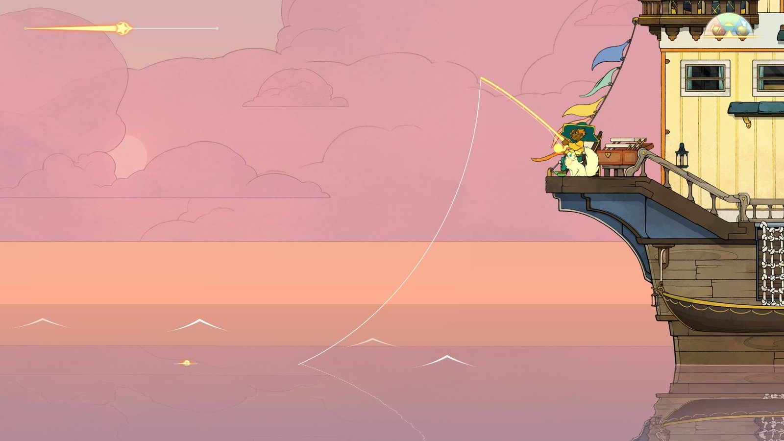 Stella récupère le nouveau bateau que Charon avait commandé mais dont il ne s’est jamais servi. Le jeu prend alors la forme d’un jeu de gestion centré sur le thème du deuil. On y contrôle Stella (ou Daffodil), dans un gameplayOu « jouabilité » en français, fait référence à la façon dont le joueur interagit avec un jeu vidéo. plateforme plutôt plaisant, alternant entre phases d’exploration d’île et voyage en bateau. Le jeu peut être joué en solo, ou bien en coop, le deuxième joueur jouant alors Daffodil, il pourra faire exactement les mêmes actions que le premier joueur, les animations de Daffodil étant toutes mignonnes à croquer !