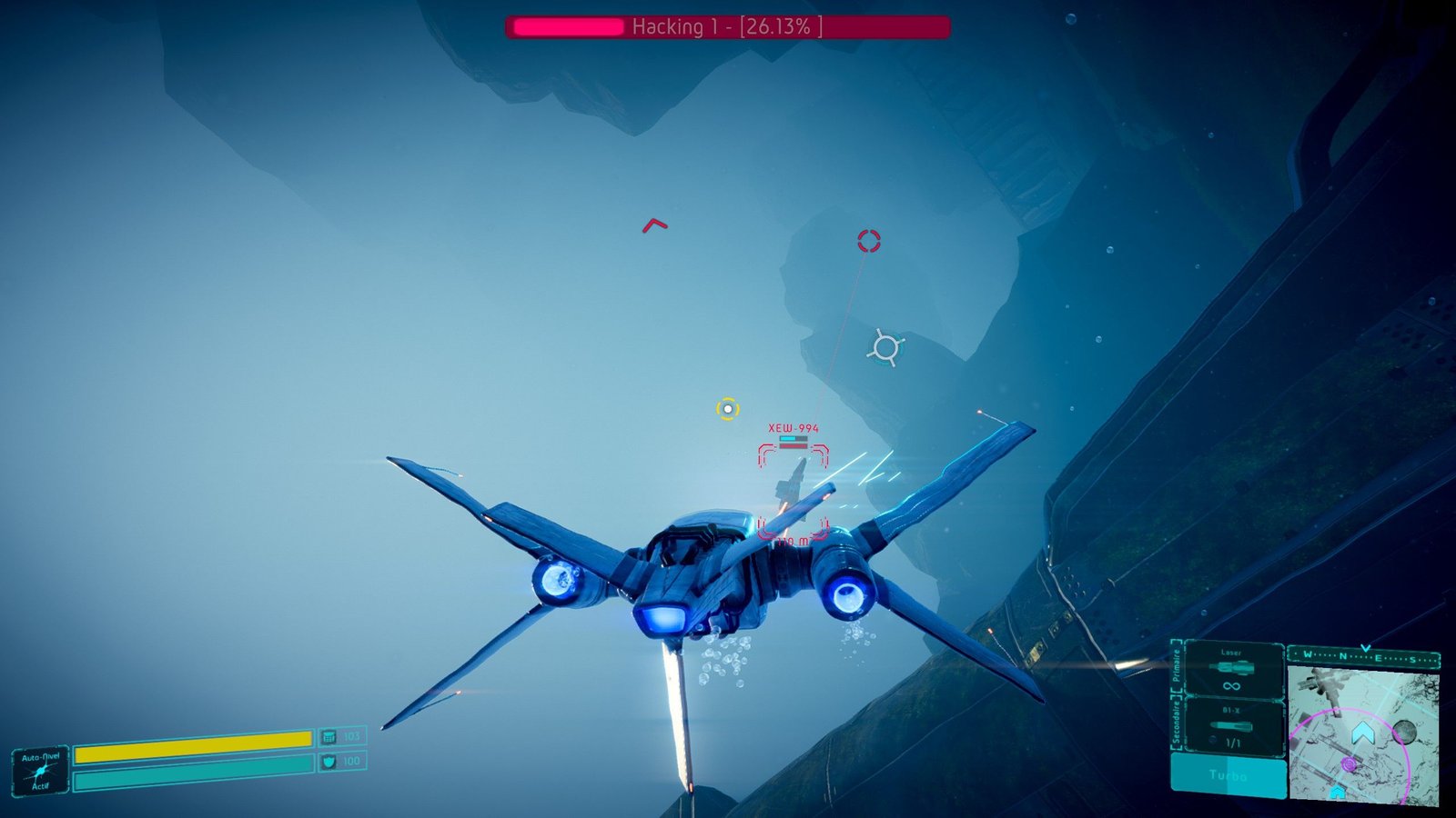 Pour ce faire, vous dirigez votre vaisseau de façon plutôt arcade, avec une gestion de la direction au clavier (ou au stick gauche) et la visée à la souris (ou au stick droit), un peu comme dans un Everspace 2 … Mais en beaucoup moins fluide cependant, le tout est en effet assez lourdaud. La palme revient tout de même aux passages de plongés hors du vaisseau qui, étrangement, sont les pires. Bien qu’on s’attende à des contrôles type FPS classique, ceux-ci sont quasi incontrôlables, avec une sensation de flottement très étrange, où le moindre mouvement de souris fait trembler la caméra dans tous les sens et donnerait la nausée en deux minutes chrono, même aux joueurs les plus aguerris à la réalité virtuelle. Ce qui a pour effet de ne pas vraiment inciter à l’exploration des petites caves qui devient rapidement un calvaire. Autre souci de gameplayOu « jouabilité » en français, fait référence à la façon dont le joueur interagit avec un jeu vidéo. , les collisions sont en général assez mal gérées, vous envoyant parfois plusieurs mètres sur un côté, pouvant même vous bloquer dans le décor.