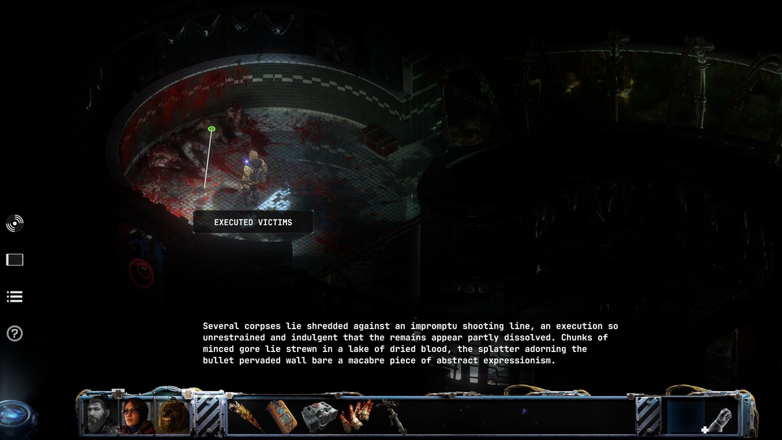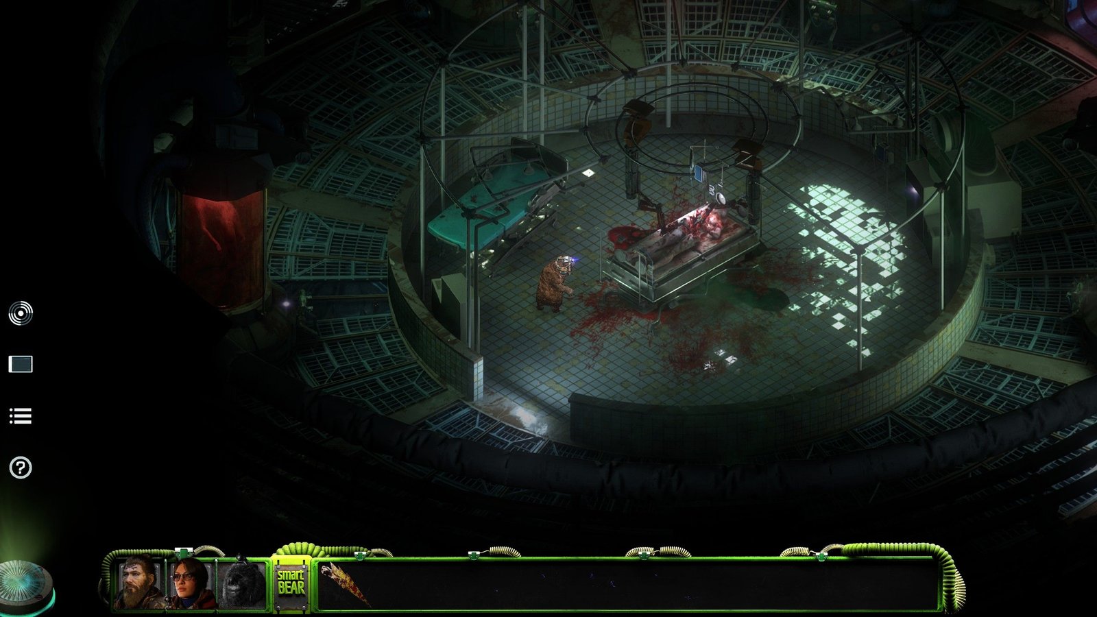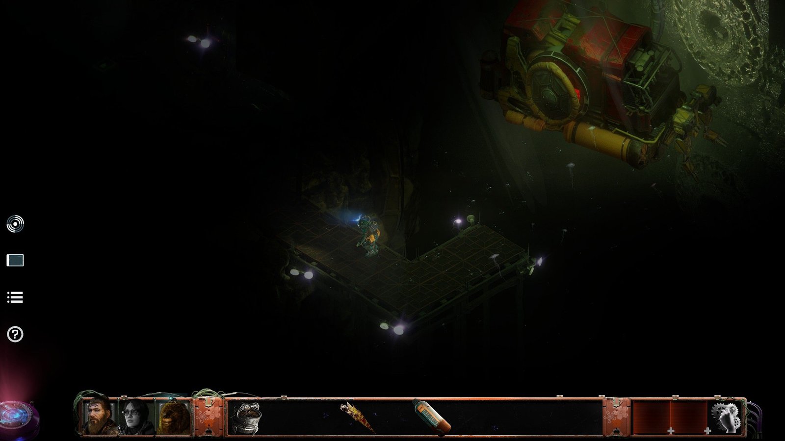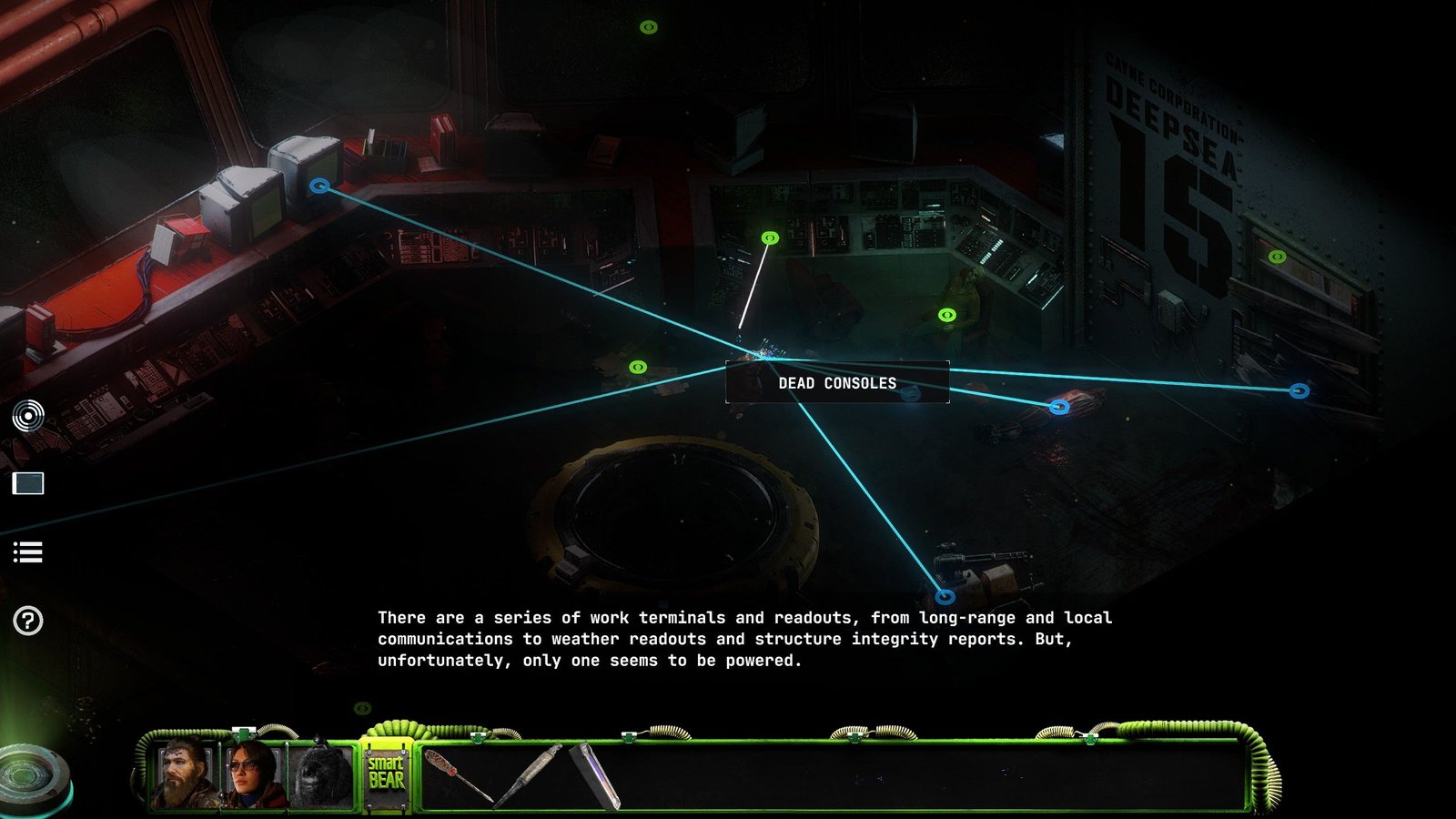 Niveau gameplayOu « jouabilité » en français, fait référence à la façon dont le joueur interagit avec un jeu vidéo., on retrouve du classique pour un jeu isométrique. Les déplacements et interactions se font d’un clic, alors qu’un clic droit permet d’afficher les zones d’intérêt à l’écran, en vert celles donnant simplement une description textuelle, un peu à la manière des premiers Fallout , permettant d’avoir une idée encore plus détaillée de l’environnement que ce que nous montrent déjà les graphismes du jeu, et en bleu les zones avec lesquelles interagir. Dans BONE TOTEM , vous contrôlez trois personnages, chacun possédant une habilité spéciale qui vous sera utile pour les puzzles/situations. Mac peut utiliser sa force pour tordre ou briser des objets, permettant ainsi de récupérer d’autres composants. Charlie, au contraire, peut combiner deux objets et les réparer. Enfin, Moses, un ours en peluche mécanique doté d’une IA, est capable de pirater les systèmes informatiques et est suffisamment petit pour se faufiler dans des endroits exigus. Il a de plus l’avantage, de par sa condition, de ne pas avoir un besoin vital d’oxygène, ce qui s’avère être fort utile au fond de l’océan.