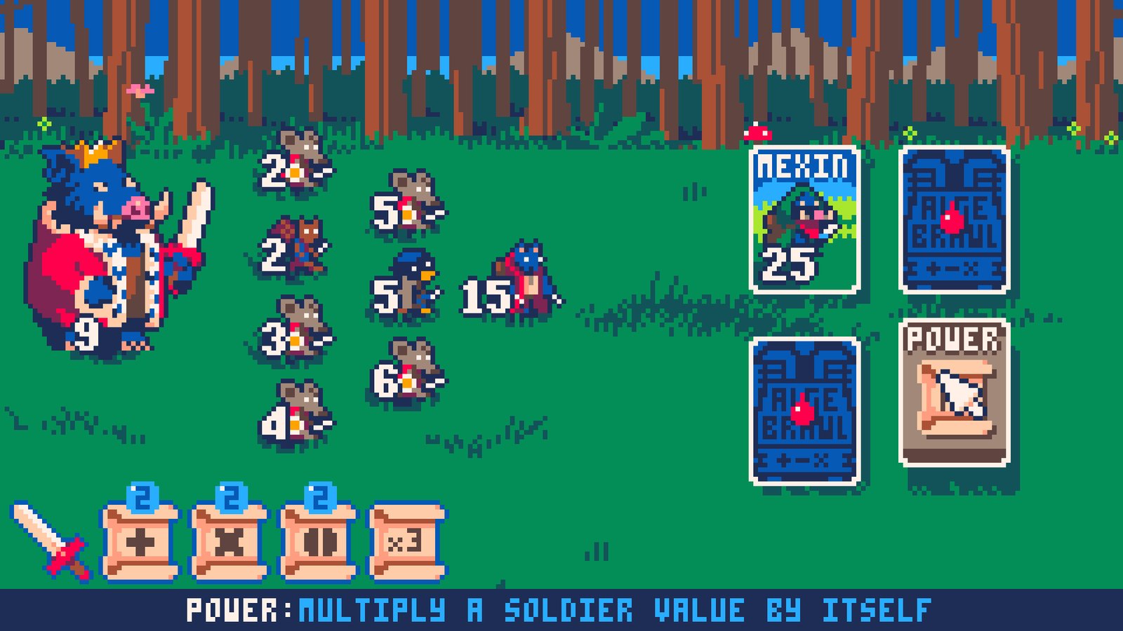 Vous voilà donc à la tête d’une troupe de combattants possédant chacun une valeur. Ce nombre est très important car pour remporter les combats vous allez devoir atteindre les mêmes valeurs que vos adversaires. Pour cela vous allez utiliser le pouvoir des mathématiques : addition, multiplication, division, carré, etc. Imaginons que vous affrontiez un gobelin 20, si vous avez un guerrier 4, un guerrier 5 et un sort de multiplication, parfait, le calcul est vite expédié.