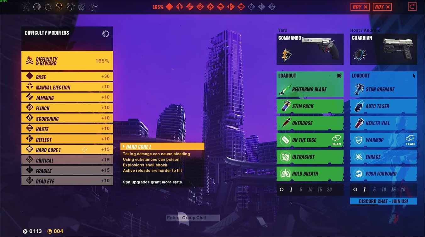La difficulté est assez élevée mais vous pourrez la paramétrer à volonté pour ajouter des bonus ou des malus à votre prochain runUne partie intégrale ou une tentative de terminer un jeu vidéo (changement de chargeur automatique, pas de gestion de la surchauffe, les blessures reçues infligent un saignement et/ou réduisent la santé maximum…). Pour vous épauler dans votre aventure, le jeu propose une coopération en ligne qui, pour ce que j’ai pu tester, fonctionne plutôt bien.