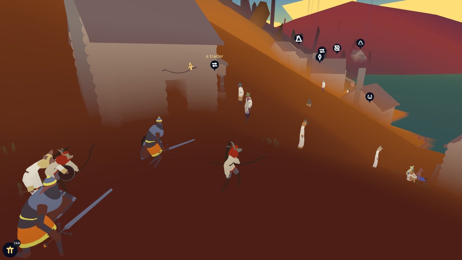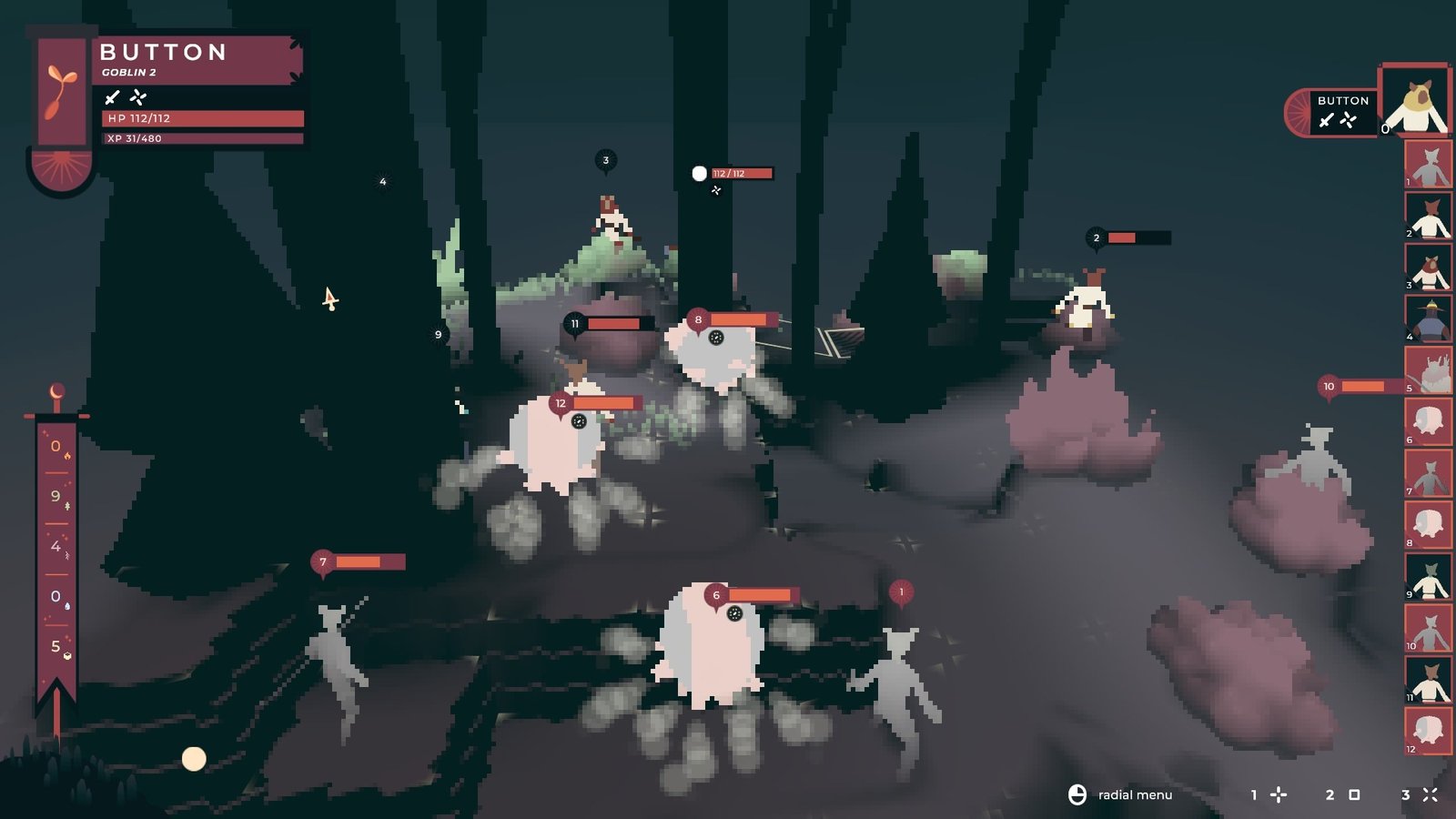 Là où Tenderfoot surprend, c’est sur tout ce qui se passe entre chaque combat. Là où habituellement on nous raconte une histoire par image fixe ou animée et que l’on se déplace d’un champ de bataille à un autre, ici vous déplacerez votre groupe de gobelins en temps réel dans un énorme archipel : Tenderfoot Tactics est un tactical en monde ouvert, et ça ce n’est pas commun. Cette idée de se balader dans un monde est géniale, permettant ainsi de prendre part au combat que l’on souhaite ou non (le niveau du combat est symbolisé par un énorme cercle allant du vert au rouge). Vous devrez parfois jouer de discrétion en esquivant de justesse les rondes ennemies pour atteindre ce refuge de repos, qui vous servira de respawn en cas de mort.