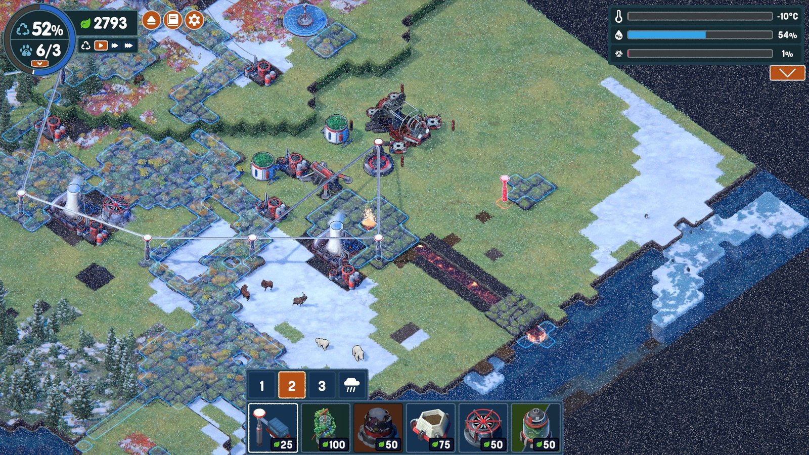 Pas vraiment un god game, Terra Nil nous propose de faire revenir à la vie une planète, via la remise en route de plusieurs écosystèmes dans diverses régions. Le principe est simple, on arrive sur une terre morte, sèche avec un crédit d’écoenergie, qui va permettre dans un premier temps de construire une source d’électricité (propre, de préférence) puis de placer des bâtiments qui vont tout d’abord assainir la terre et l’eau, puis faire reverdir les terres nouvellement fertiles. Ensuite il faudra réintroduire la flore avec d’autres bâtiments, qui vont avoir des contraintes d’emplacement, ou de fonctionnement, et enfin une fois la zone remise à son état le plus vivable pour ses futurs habitants à écailles ou à fourrure, réintroduire les espèces animales en scannant les endroits où ils sont le plus propices à se trouver, gérer la température, l’humidité et d’autres paramètres climatiques, et enfin repartir en emportant toutes les constructions artificielles, comme s’il fallait ranger ses jouets éparpillés dans une chambre où aurait poussé une forêt tropicale.