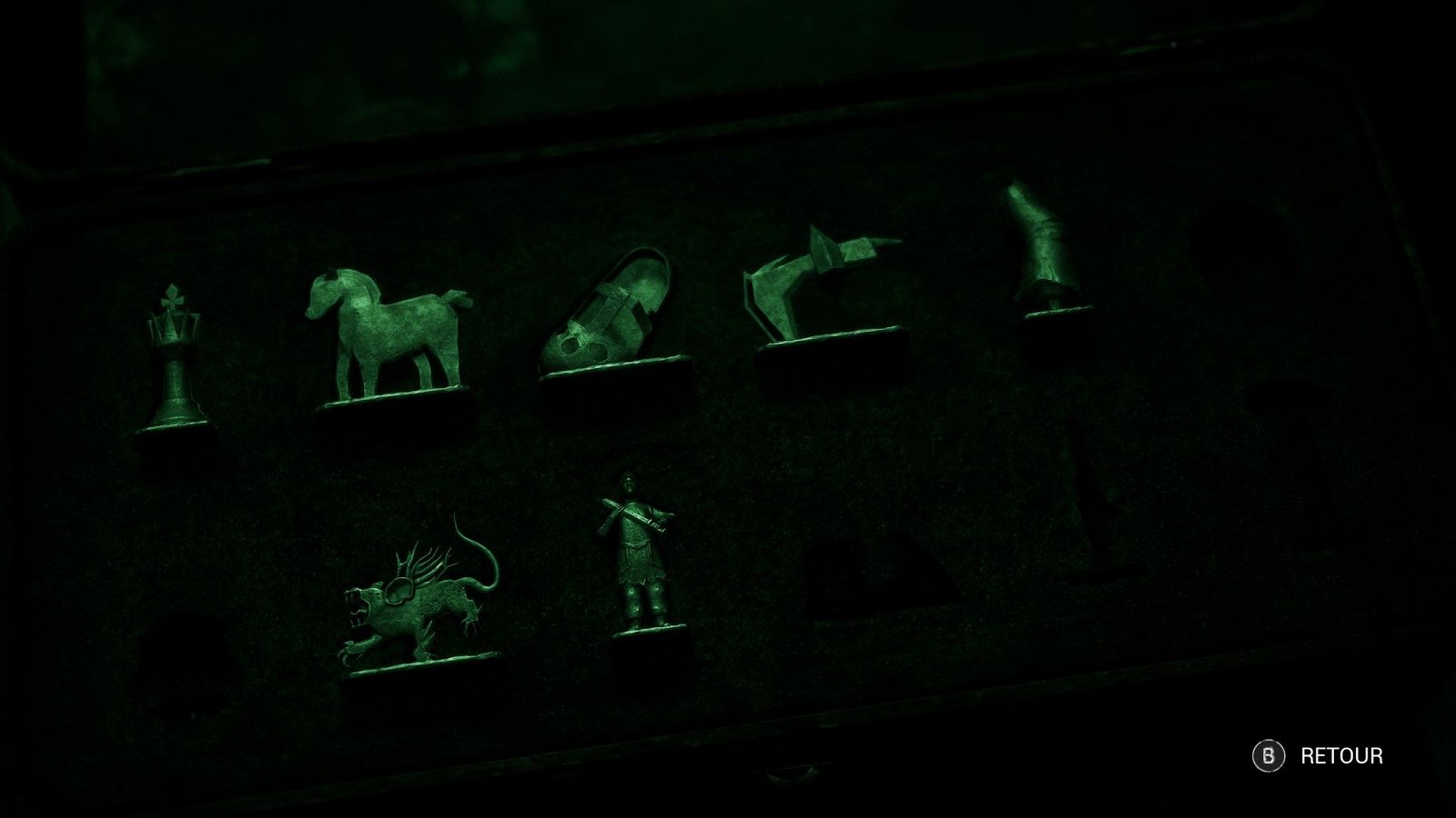 S’éloigner du chemin tout tracé est quelques fois possible, cela permet de trouver des objets qui nous seront utiles plus tard, où des documents permettant de mieux connaître Frank Stone et comprendre ce qu’il s’est passé, mais aussi des collectiblesObjet d'inventaire devant être collectionné. sous forme de babioles et de reliques du tueur. Les babioles sont 12 petites sculptures en métal rangées dans des petits coffres similaires à ceux de Dead by Daylight, et les reliques du tueur, 12 poupées à l’effigie des tueurs de Dead by Daylight (le Spectre, le Clown, le Montagnard, l’Infirmière, les Jumeaux, le Farceur…). Les trouver n’est pas toujours si simple, il faut bien fouiller mais, une fois le premier runUne partie intégrale ou une tentative de terminer un jeu vidéo achevé, l’Instinct du Pillard des survivants de Dead by Daylight sera débloqué et les fera apparaître en surbrillance (le rendre disponible dès le départ en cas de précommande est une drôle d’idée). La salle de montage (disponible dès le début dans la version Deluxe ou après le premier run en version classique) permet de reprendre le scénario à un point précis et indique clairement ce qui a été ou non récolté. Libre à vous alors d’y retourner pour trouver ce qu’il vous manque. C’est aussi intéressant de déverrouiller de nouvelles branches et explorer un nouvel axe scénaristique, malheureusement cela n’est pas assez flexible et oblige à refaire plusieurs scènes avant de pouvoir obtenir ce que l’on veut, ce qui peut s’avérer décourageant. La durée de vie s’en trouve en tout cas rallongée, mais c’est aussi un moyen d’essayer de mieux comprendre le scénario, car la fin nous laisse clairement sur notre faim, toutes les réponses n’étant pas données en plus d’être abrupte. Les conclusions restent un problème chez Supermassive Games.