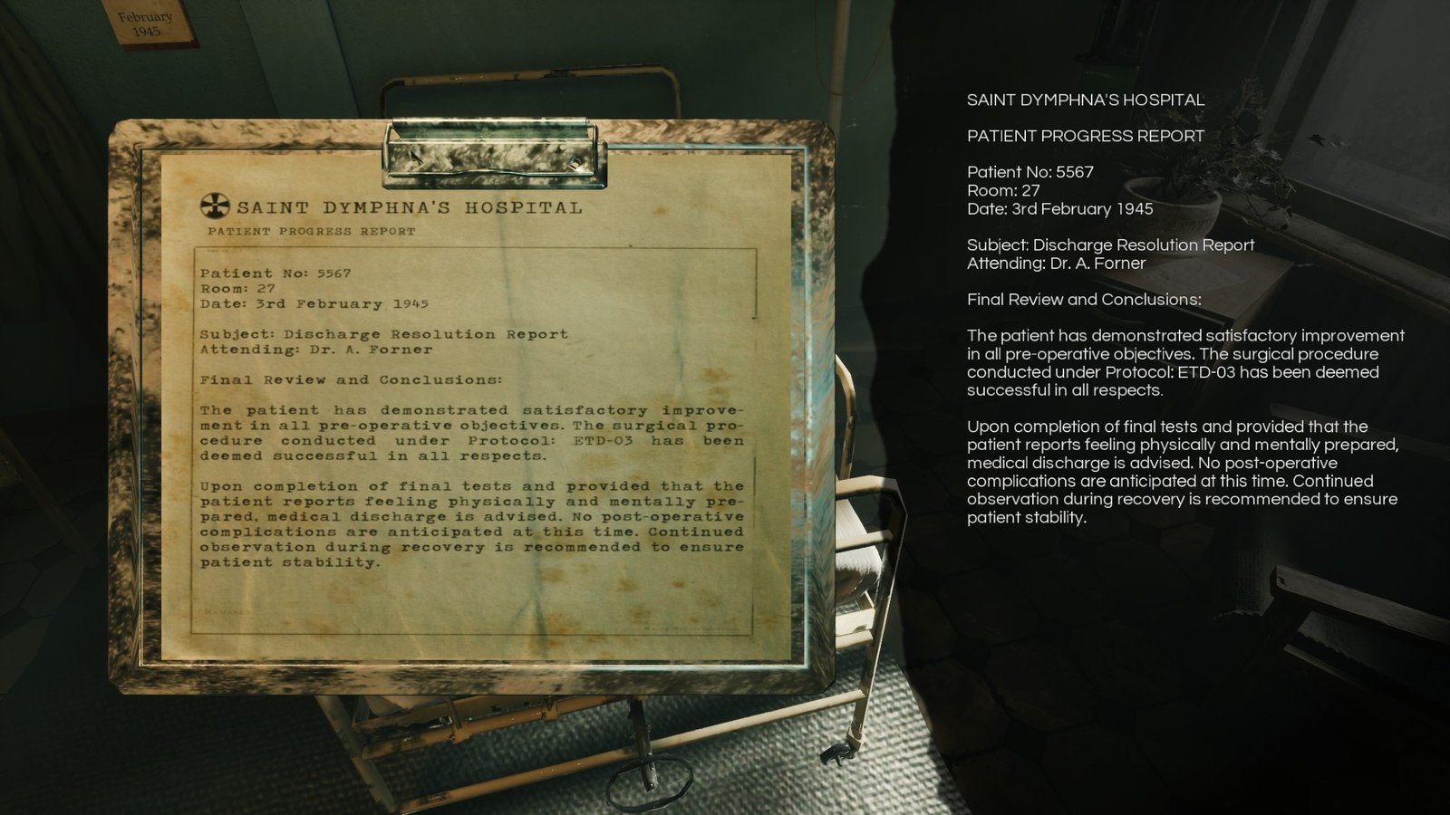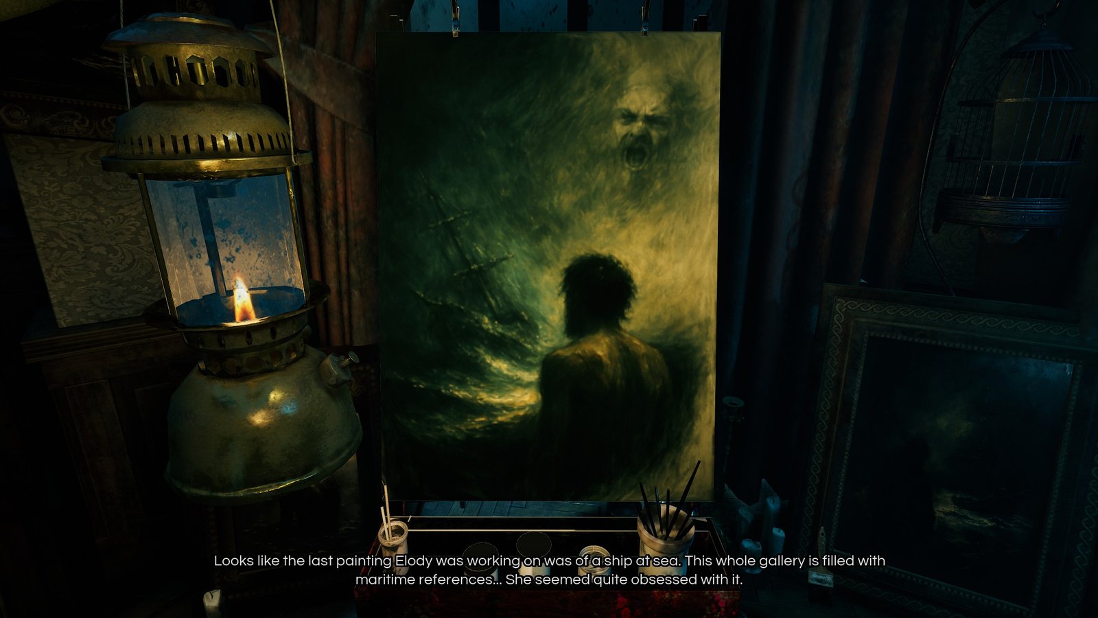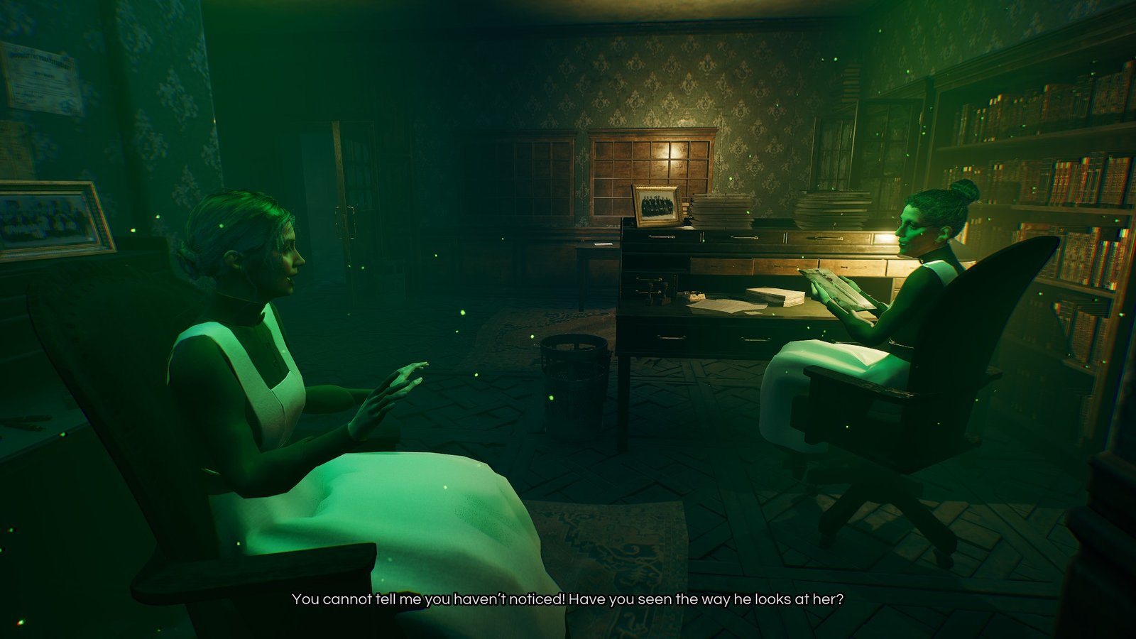 Tout commençait donc très bien, malheureusement, les promesses vont petit à petit s’effondrer en entrant dans le vif du sujet. L’enquête nous emmène sur le lieu du crime, un vieux manoir délabré inhabité depuis 20 ans. L’occasion de jeter un œil sur la chambre d’Elody Fordside, la fille de Margaret, intouchée depuis l’incident. C’est là que le bât blesse, on s’aperçoit rapidement des limites du gameplayOu « jouabilité » en français, fait référence à la façon dont le joueur interagit avec un jeu vidéo. de The Last Case of John Morley. Il s’agit en effet principalement d’un walking simulatorOu « simulateur de promenade ». Sous-genre du jeu d'aventure, fondé sur l'atmosphère et la découverte plutôt que le gameplay.. On entre dans une pièce, observe tout ce qui est possible, on lit les rares documents qui traînent, et on déclenche les indices verts pour faire avancer le schmilblick. En interagissant avec ceux-ci, John déclenche une représentation mentale des évènements passés, comme des bribes de discussion. Contrairement à ce qu’on peut voir dans un Sherlock Holmes, ça ressemble plus ici à de la prescience qu’à de la déduction, qui plus est, non interactive.