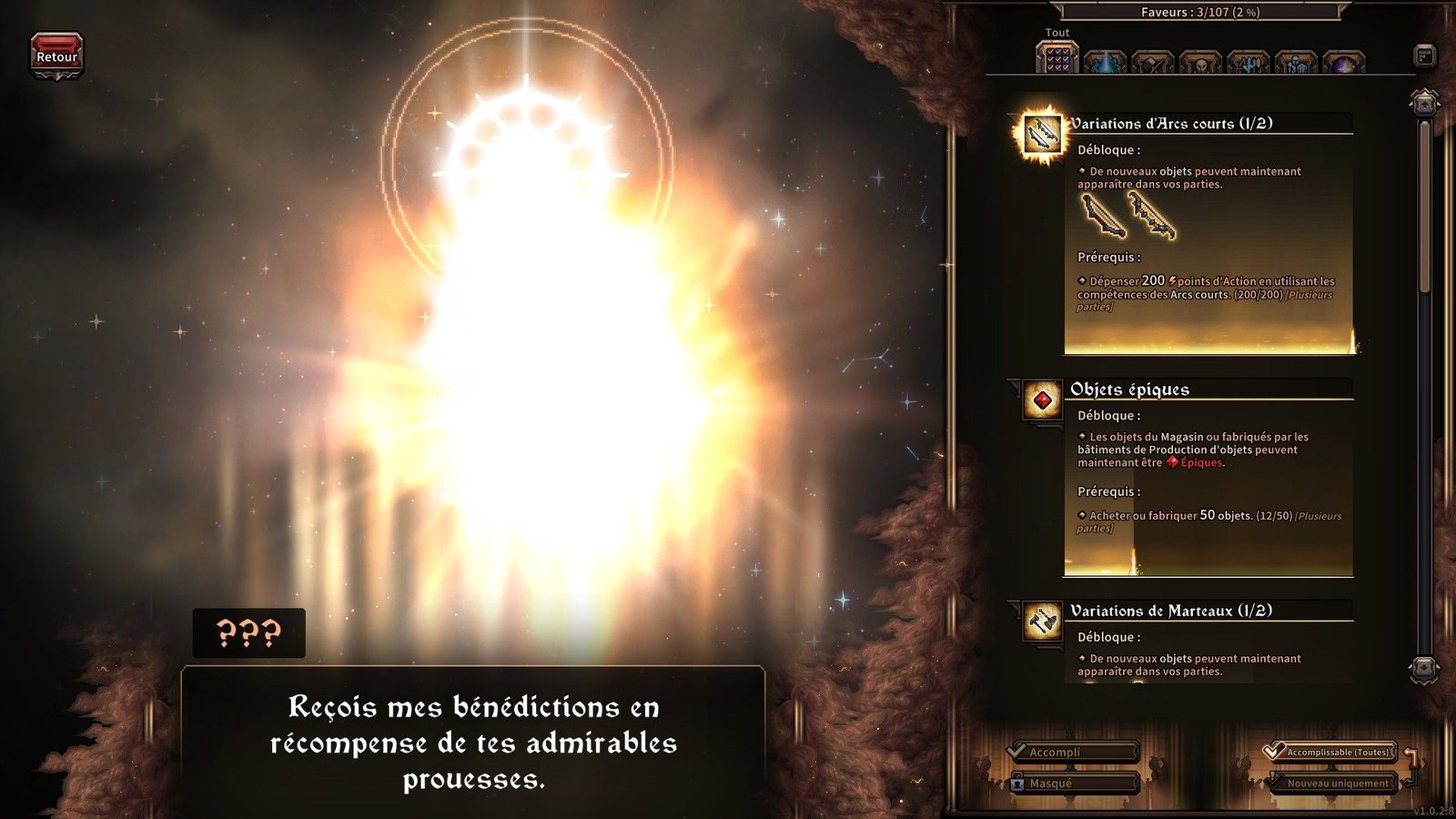 Si le jeu est plutôt complexe, notamment pour les personnes n’ayant pas un BAC+5 en tactical RPG , il saura récompenser les personnes qui prendront le temps de défendre des villes quel qu’en soit le résultat. Parce qu’en plus d’être un mélange de t actical RPG et de Tower défense / gestion de ville, The last spell est surtout un rogue-lite. Ainsi, après chaque nuit, les essences impures que vous récolterez vous permettront de débloquer du nouveau matériel ainsi que des traits plus avantageux pour vos héros, de nouveaux bâtiments, mais aussi des présages. Ces derniers sont à choisir en début de partie (avec un nombre limité), permettant d’ajouter de gros bonus à votre partie. Afin de rendre le jeu plus accessible, vous aurez la possibilité de passer en mode « sans limites » et ainsi sélectionner autant de présages que vous le souhaitez. Hélas, cette option devient vraiment intéressante (pour les personnes qui recherchent un challenge moindre) qu’après s’être déjà bien cassé les dents pour en débloquer suffisamment.