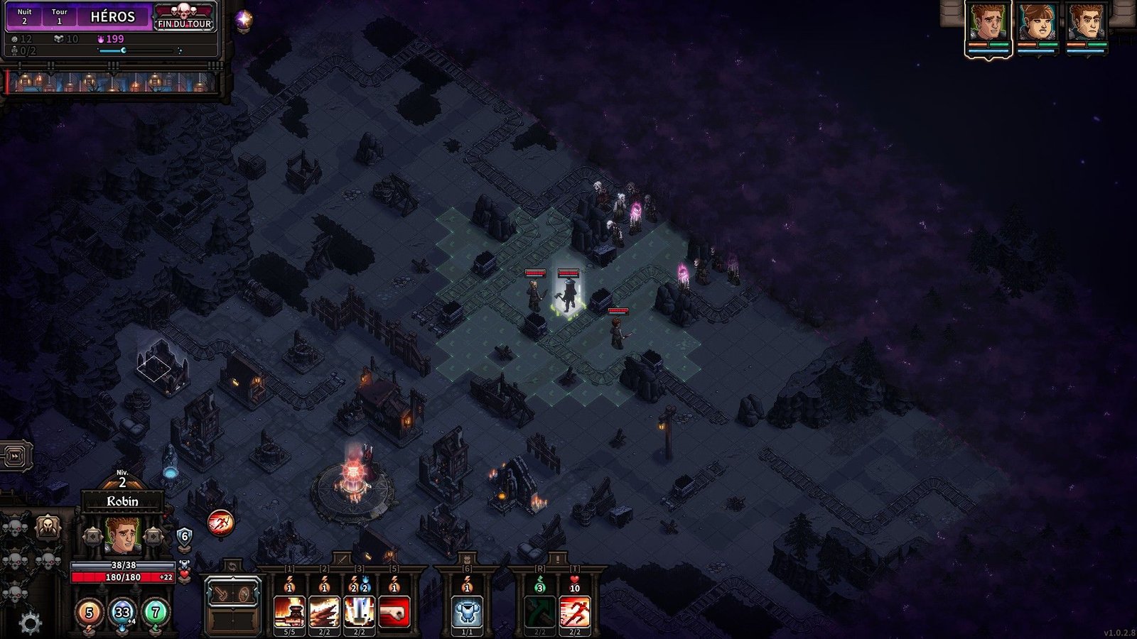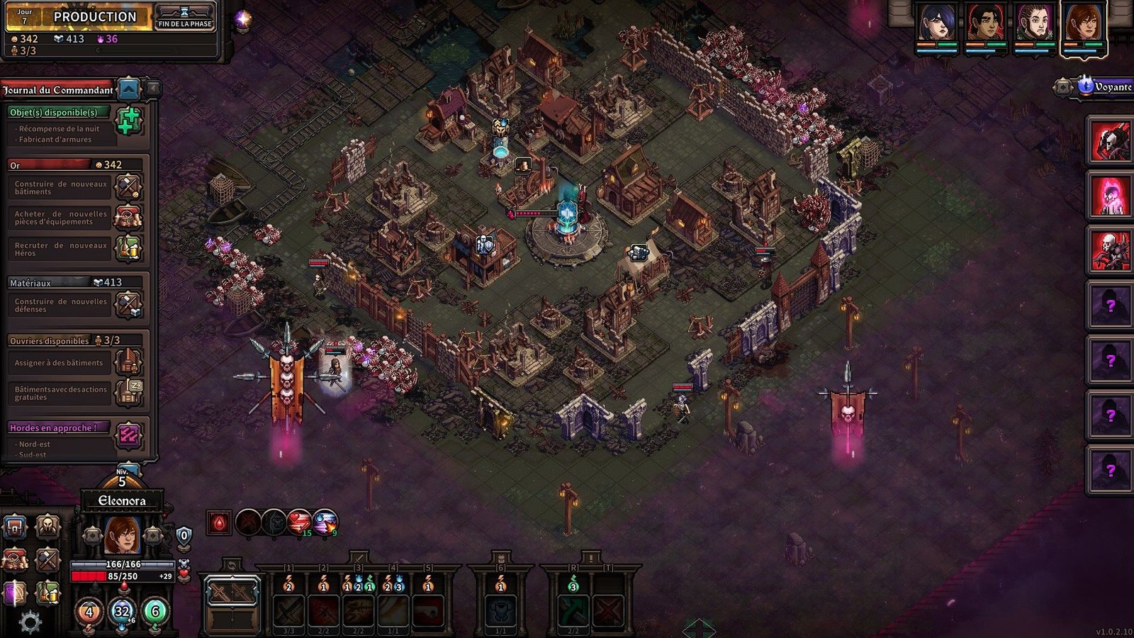 Le jeu se déroule en trois phases : la journée, où vous pourrez respirer, fortifier votre ville et soigner vos blessures. Au coucher du soleil, il faudra placer vos héros en fonction de l’arrivée des vagues, et enfin, à la nuit tombée, combattre les centaines de monstres qui vous attaqueront. Heureusement, les monstres ne sont pas très forts, et vos héros sont des machines de guerre. Si au départ, vous ne démarrez qu’avec trois héros (un guerrier, un archer et un magicien), vous pourrez en recruter d’autres (la limite dépend de la ville dans laquelle vous jouerez ainsi que de la difficulté) à condition d’avoir construit une taverne. Chaque héros aura ses propres caractéristiques, notamment via 3 traits de caractère qui donneront des bonus et/ou malus. En ce qui concerne les aptitudes de combat, elles seront directement dépendantes de l’équipement porté, et donc principalement de l’arme. Elles auront toutes une attaque basique, ne consommant qu’un seul point d’action et pas de mana, puis deux voire trois compétences supplémentaires, qui pourront venir consommer plus ou moins de points d’action et de mana. Sachant que ce dernier ne se régénère pas pendant la nuit, seul le lever du soleil permettra d’en récupérer une quantité définie par la régénération de mana de votre personnage. Il faudra donc connaitre parfaitement les effets des armes pour assurer correctement les défenses de votre cité, en jouant sur l’ensemble des effets de vos attaques (de zone, poisson, étourdissement, etc.).