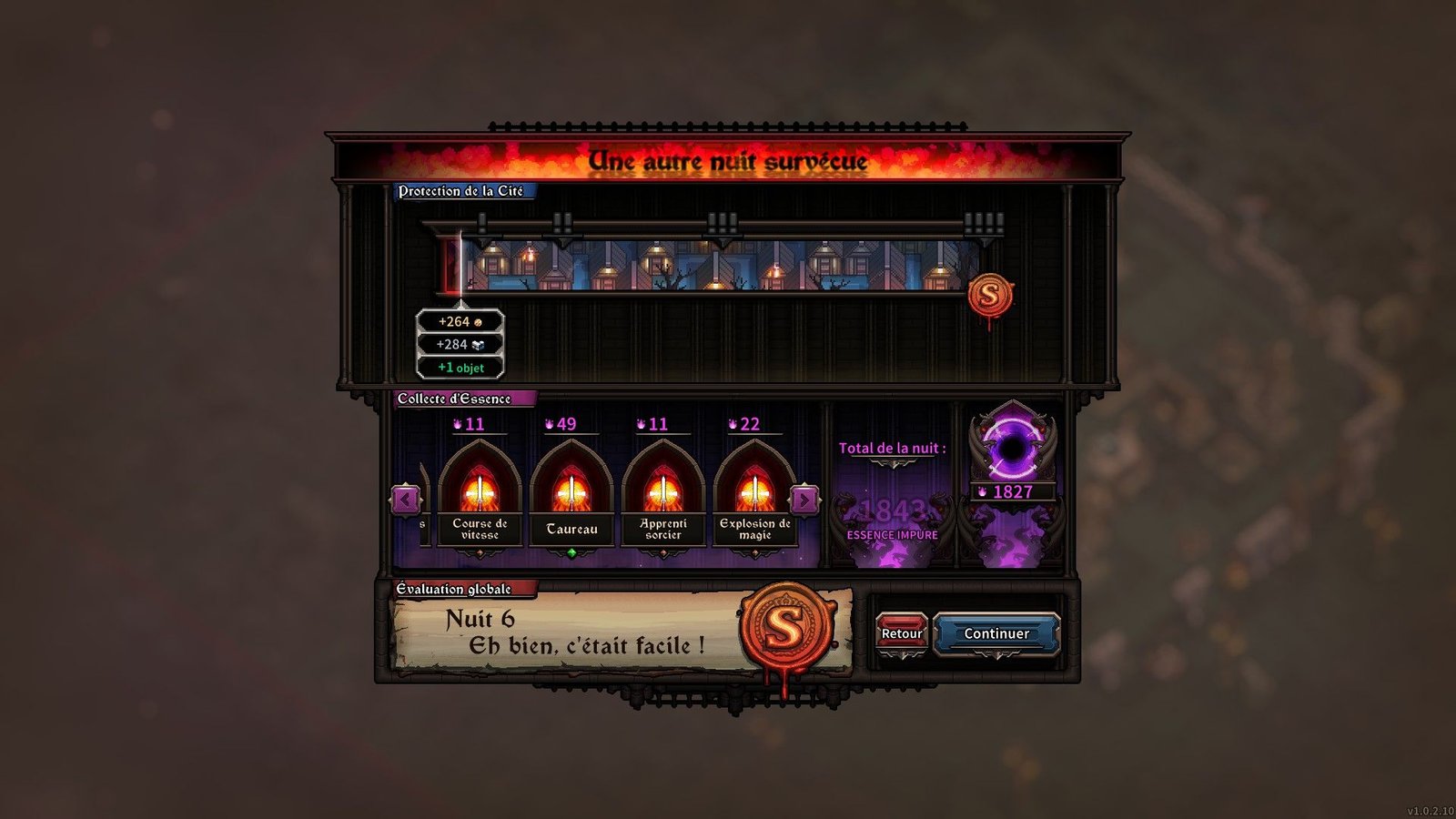 Une fois une nuit terminée, vous obtiendrez de l’essence impure ainsi que de l’or et des briques en fonction du niveau d’alerte présent en ville : dès lors qu’un ou plusieurs monstres entrent en ville, l’alerte augmente peu à peu. Les briques vous permettront de construire vos défenses (murs, portes, balistes, catapultes et pièges), quant à l’or, il permettra de construire les bâtiments que vous aurez débloqués, ainsi que d’acheter du meilleur équipement pour vos héros et d’en recruter de nouveaux. Le choix de l’ordre de dépense de l’or, entre améliorer votre ville ou vos héros sera primordial, car évidemment, vous ne pourrez pas tout adresser à chaque journée.
