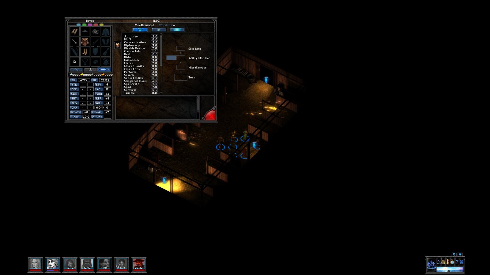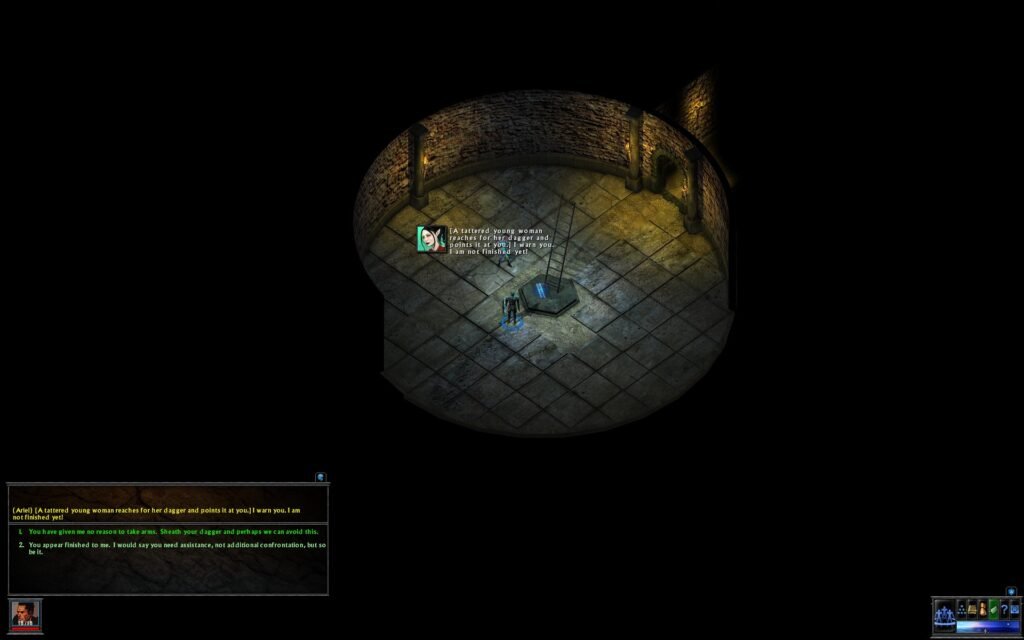 Déjà en 2003, avec les bugs et tout, j’avais trouvé le jeu un peu ardu, les combats sont âpres et les victoires coûtent effroyablement cher. Le jeu suit strictement les règles de Donjons et Dragons 3.5, et s’y aventurer sans connaître ne serait-ce que le moindre fonctionnement de la magie ou des types d’action de combat, des effets secondaires etc., est une erreur qui se paye cher. Dès la création du personnage, il faudra savoir ce que l’on fait et comment faire le groupe le plus équilibré qui soit, car le jeu n’aidera pas vraiment à s’en sortir. Alors on peut toujours se pencher sur le manuel qui explique les règles mais bon c’est un pdf de plus de 100 pages alors accrochez-vous à votre slip. On va dire que la courbe d’apprentissage est verticale sans exagérer. De fait, tenter de s’extirper des diverses embuscades, embûches et affrontements n’est pas une chose facile, déjà quand on maîtrise à peu près les règles, alors en y allant la fleur à l’arbalète en se disant que “c’est bon, j’ai fait Baldur’s Gate 3, ça va bien se passer” on risque de se taper un vilain mur de difficulté (et qui n’est semble-t-il pas franchement aidé par un aléatoire vaguement en défaveur des joueurs). Bon ben on aurait pu penser que ressortir le jeu s’accompagnerait d’un peu d’aide contextuelle ou d’une courbe d’apprentissage un peu plus lisse, disons, mais non, il est possible de crever bêtement dans la ruelle censée lancer le début de l’aventure.