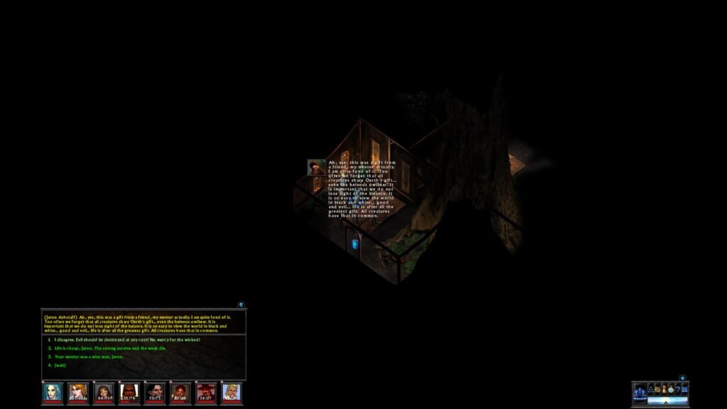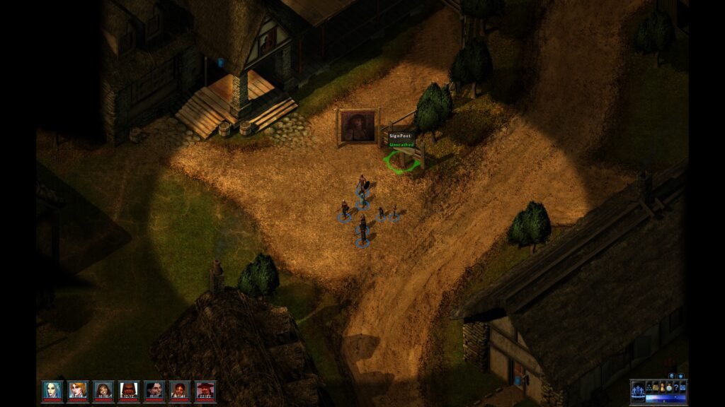 Côté technique, on est face à un jeu de 2003, malheureusement, la ressortie ne fait pas vraiment d’effort pour adapter le jeu à un affichage qui est considéré comme raisonnable aujourd’hui. Si vous le lancez en fenêtré, sur un écran 2k ou 4k, armez-vous d’une loupe, les textes seront indéchiffrables. L’interface reste désespérément adaptée au 1024*768 qui était encore la définition la plus répandue à l’époque. Sinon, bon ben c’est plutôt joli et détaillé, on retrouve des décors en 3D isométrique à la Baldur’s Gate ou Arcanum, où les petits bonhommes se déplacent librement, quoiqu’un peu trop lentement, heureusement qu’on débloque assez rapidement un voyage éclair. L’inventaire et l’équipement sont abominables mais l’interface de combat avec un menu radial est une bonne idée.
