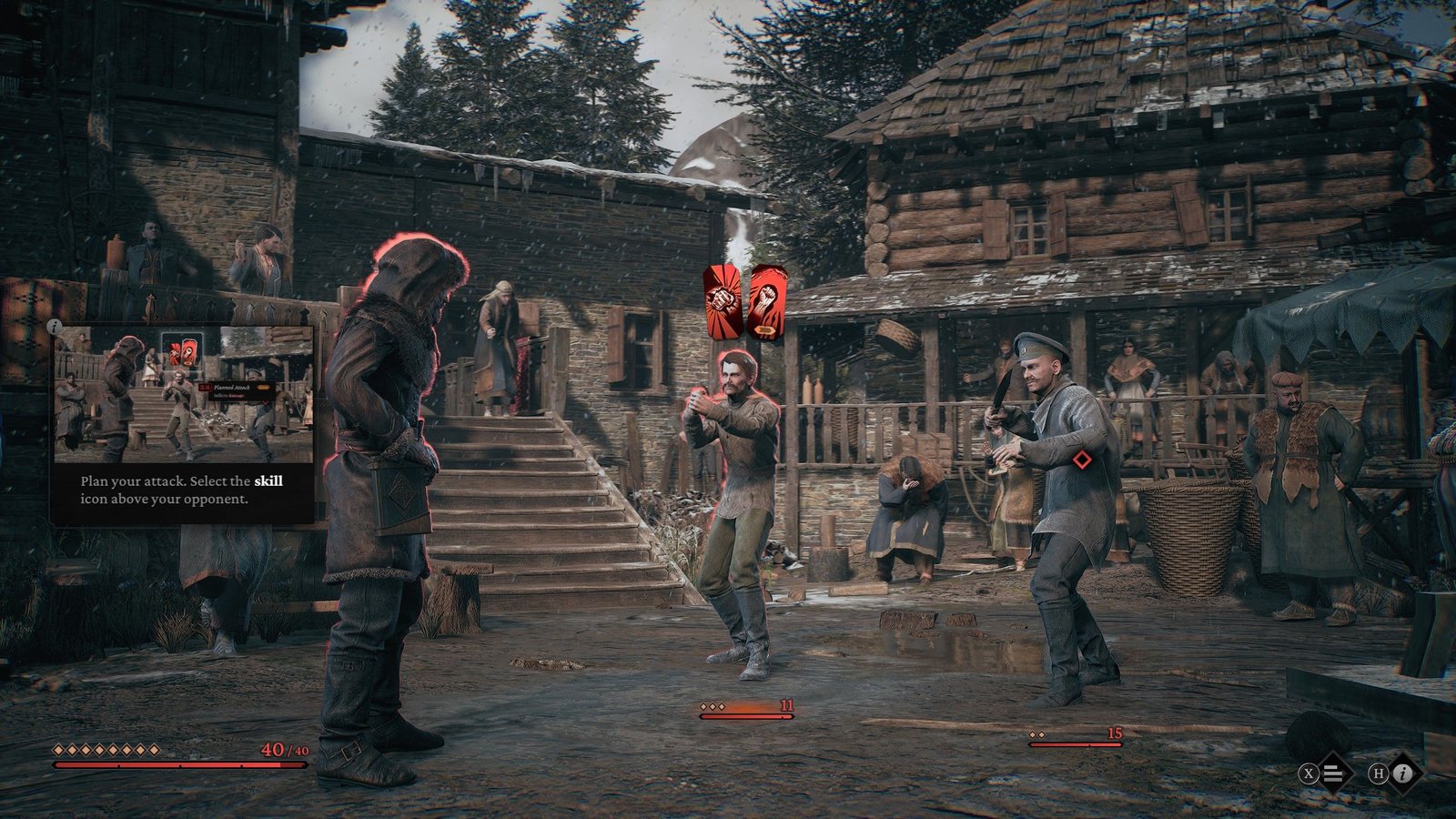 En parlant de combat d’ailleurs, ceux-ci se passent au tour par tour avec un système de cartes représentant des aptitudes différentes. Si de prime abord, on pouvait penser qu’il s’agirait d’un système simpliste servant plus de gimmick, au final, il n’en est rien, et le système proposé révèle une vraie richesse. Sans non plus atteindre des sommets, on est tout de même content de voir que les combats présentent un réel intérêt. Ici, chaque action à un indice de vitesse qui vient modifier la file d’attente représentant l’ordre dans lequel les personnages impliqués vont agir, visible grâce à vos pouvoirs de Thaumaturge bien entendu. Les capacités les plus puissantes sont plus lentes, et voient donc le risque que votre adversaire attaque en premier. Chaque personnage possède également une jauge de concentration, sorte de volonté mentale, qui pourra être réduite grâce à des attaques spécifiques. Une fois réduite à zéro, des attaques surpuissantes pourront alors être lancées. Bien évidemment, vous ne serez pas seul dans ces affrontements. Chaque tour, en plus de l’action de Wiktor, vous pourrez en effet faire agir l’un de vos Salutors pour vous venir en aide. Il faudra donc apprendre à jongler entre eux et tirer avantage de leurs spécificités pour espérer l’emporter. C’est d’autant plus important que ce sont les seuls capables de retirer certaines compétences spéciales protégeant les ennemis, telles que des réductions importantes des dégâts reçus ou des résistances aux altérations d’état. Là où ça devient encore plus intéressant, c’est qu’en faisant évoluer son personnage à l’aide des points de Thaumaturgie glanés en montant de niveau, vous débloquerez des effets supplémentaires qui peuvent être associés aux aptitudes de Wiktor ou celles des Salutors . Dans les faits, on peut donc, et doit, imaginer des combos terriblement efficaces et tirer avantage des interactions possibles entre les capacités. C’est vraiment une bonne surprise, fonctionne très bien, et donne au final un côté presque puzzle aux combats. C’est notamment vrai pour les combats de boss, comme les captures de Salutors , où il faut bien réfléchir à la stratégie à mettre en place et anticiper chaque action.