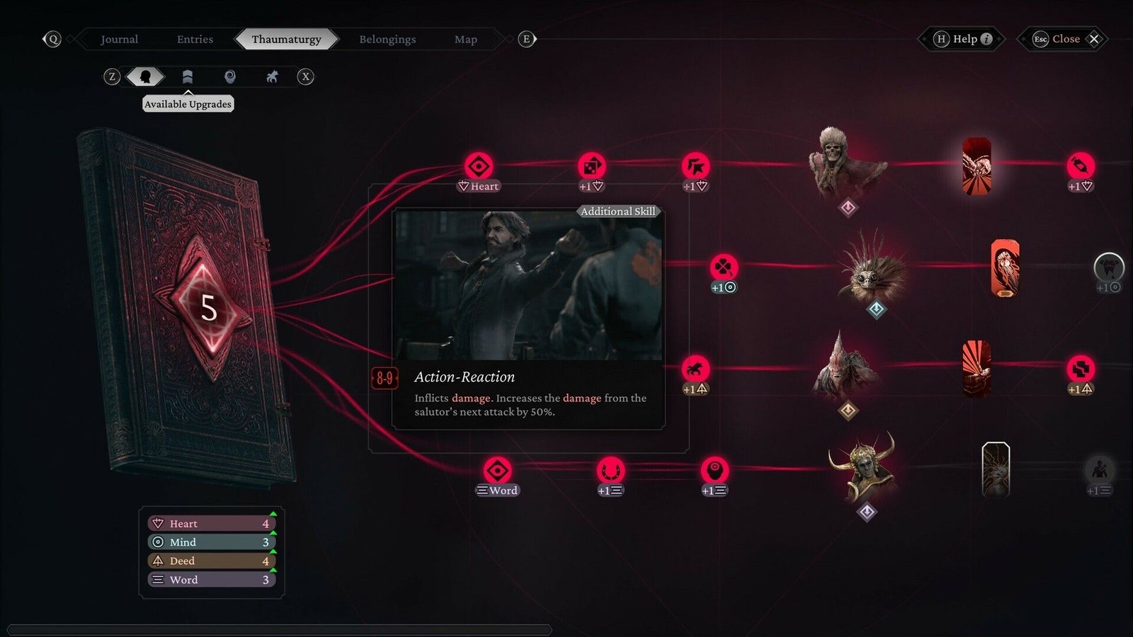 Vous l’aurez donc compris, The Thaumaturge est un RPG qui mise énormément sur l’ambiance de son univers, mais également sur la narration. Dans ce domaine, c’est d’ailleurs du très bon. Comme on l’a vu, l’ambiance est assez convaincante, et la qualité des dialogues, que ce soit dans l’écriture ou dans la prestation des acteurs, fait que vous restez constamment immergé et happé par ce qu’il se trame. Les personnages principaux rencontrés sont pour la plupart intéressants, avec une personnalité propre et bien définie. Et qui dit RPG narratif, dit choix de dialogues et conséquences. Certains choix vont en effet influencer certains dialogues, avec des réponses qui pourront être par exemple inaccessibles selon vos choix précédents. De la même façon, certaines réponses dépendront de votre niveau de fierté, pour rappel votre défaut principal, qui se renforce plus vous y faites appel en dialogue, mais aussi de vos niveaux de compétence dans une dimension donnée, correspondant elle à un aspect de personnalité ainsi qu’à un arbre de compétences distinct.