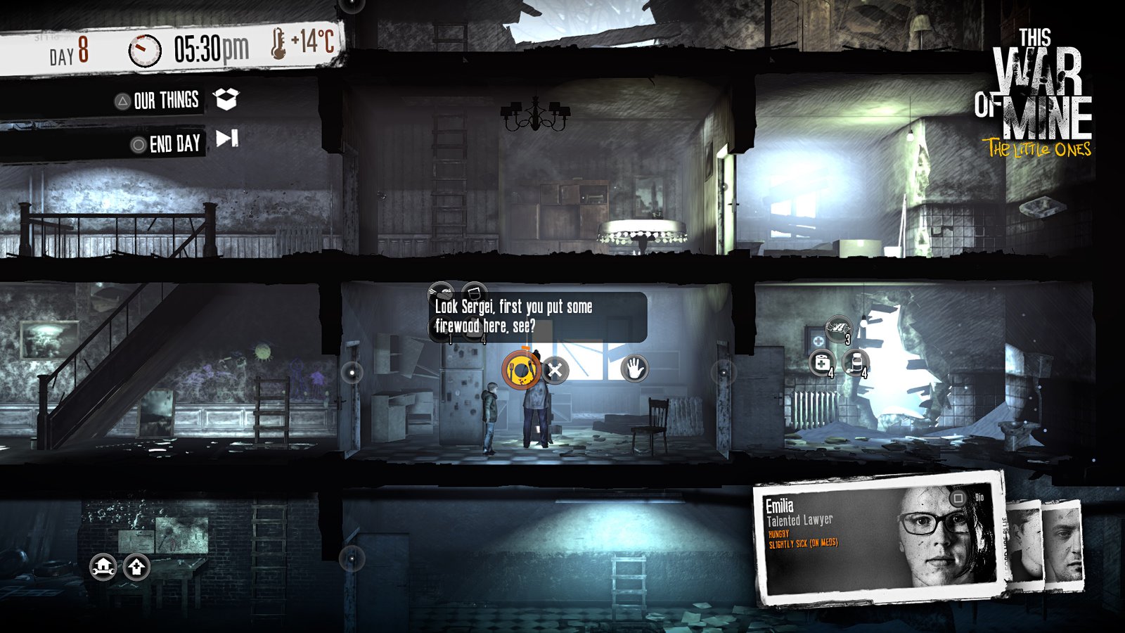 Ceux-ci avanceront d’un pas plus lent, démoralisés, dégoutés par la vie. Il vous faudra gérer le stress, le moral et tout ce qui s’en suit en trouvant des ressources, en réussissant à créer des objets du quotidien qui deviendront salvateurs. Il faudra en équiper votre maison et survivre un maximum de jours sans mourir, sans voir vos personnages fuir les lieux par abandon. This War of Mine est un jeu extrêmement difficile, autant d’un point de vue récit qu’au niveau de son gameplayOu « jouabilité » en français, fait référence à la façon dont le joueur interagit avec un jeu vidéo..