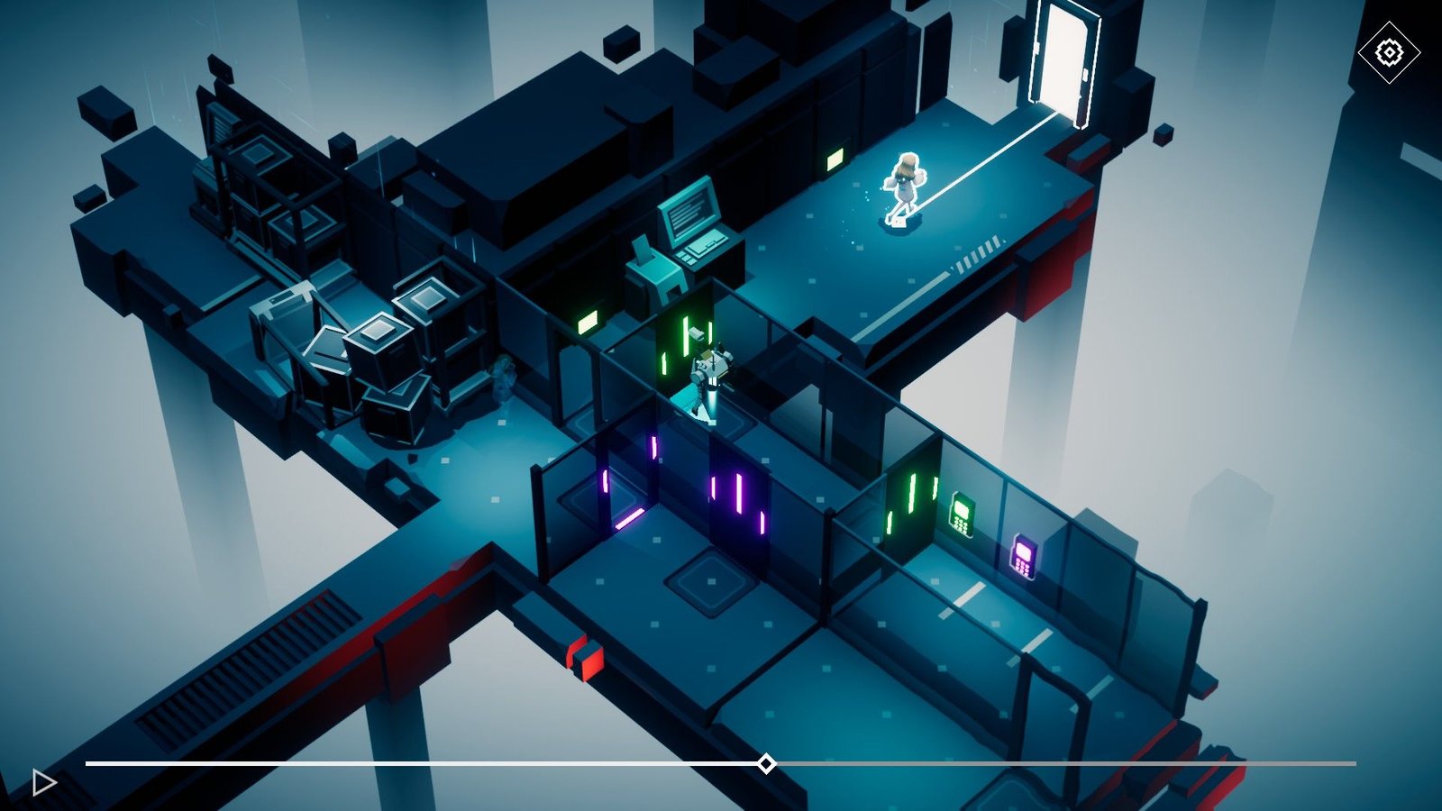 Timelie, comme son nom l’indique est un jeu où on va faire « mentir » le temps. On y dirige une petite fille, probablement, qui tente a priori de s’échapper d’un laboratoire bizarre. Vous vous en doutez, ce n’est pas un jeu dont le scénario est la pièce maîtresse… Bref, poursuivie par des robots de sécurité, la gamine va découvrir qu’elle peut manipuler le temps. Enfin, pas vraiment. A la manière de Docteur Strange à la fin d’Avengers Infinity War, elle peut « consulter » le futur, en manipulant une ligne de temps potentielle, et trouver une suite d’actions qui va permettre de finir le niveau. Avec la souris on clique donc à l’endroit où on veut qu’elle aille et le temps s’écoule pendant le déplacement, les ennemis se déplacent, réagissent, etc. En cas d’erreur, on rembobine et on essaye autre chose. Quand la bonne suite d’actions est réalisée, on revient au début de la ligne de temps et le niveau se déroule sans notre intervention, comme une petite cinématique. C’est tout à fait gratifiant de voir les actions testées parfois au ralenti ou au coup par coup s’enchaîner de manière totalement fluide. La petite fille va parcourir ainsi une quarantaine de tableaux répartis dans cinq niveaux à la difficulté qui va crescendo et vont demander beaucoup de doigté et de réflexion.