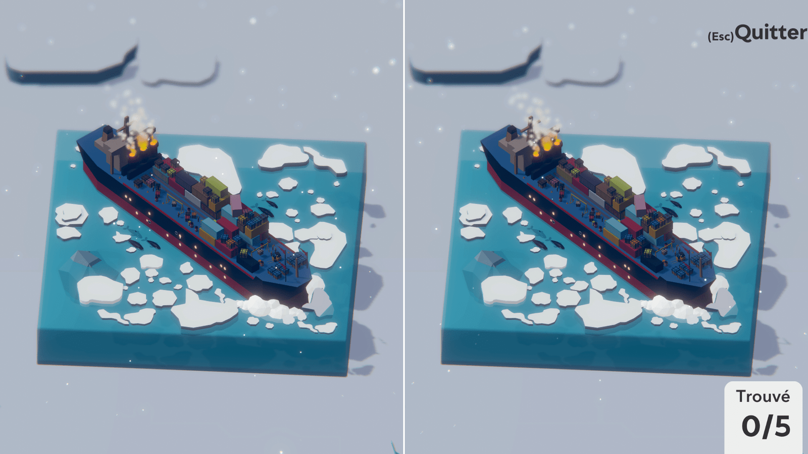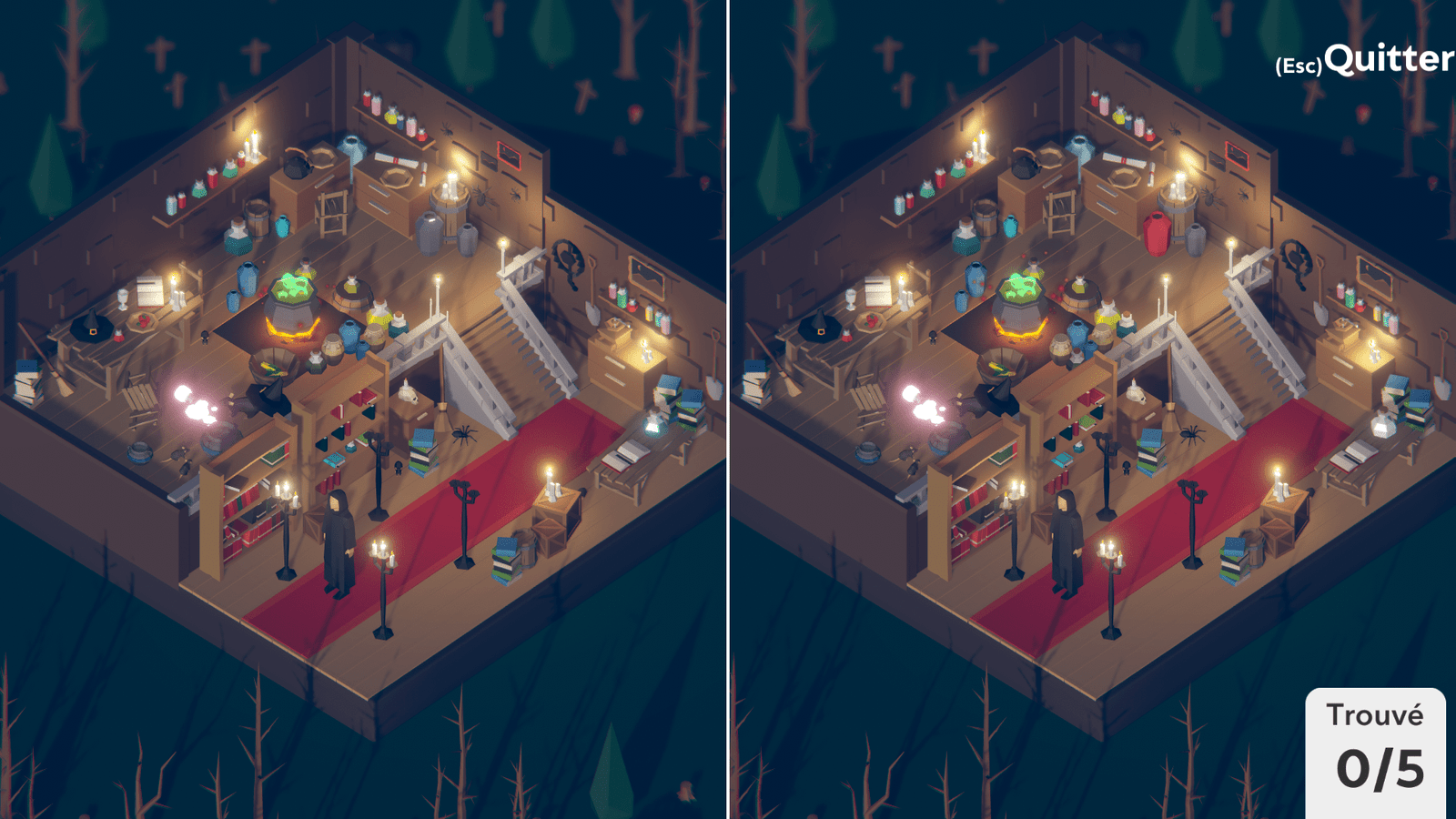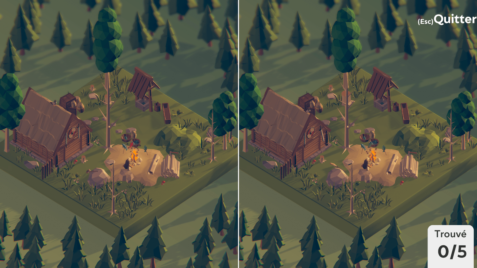 Posez ces lunettes à verres bleu et rouge, Tiny Lands ne propose que des dioramas – ou maquettes, ou décors de boules à neige – que vous pouvez observer en tournant la caméra ou bien en zoomant. A gauche et à droite, deux versions d’un même décor, à ceci près que 5 éléments qui les composent varient : leur taille, leur emplacement, leur orientation ou encore – évidemment – leur couleur. Quelques clics sur les intrus plus tard, votre œil aiguisé vous permet de passer au tableau suivant. Le jeu est construit autour d’un système d’étoiles obtenues à chaque découverte et qui sont dépensées pour débloquer le monde suivant. Rien de plus simple.